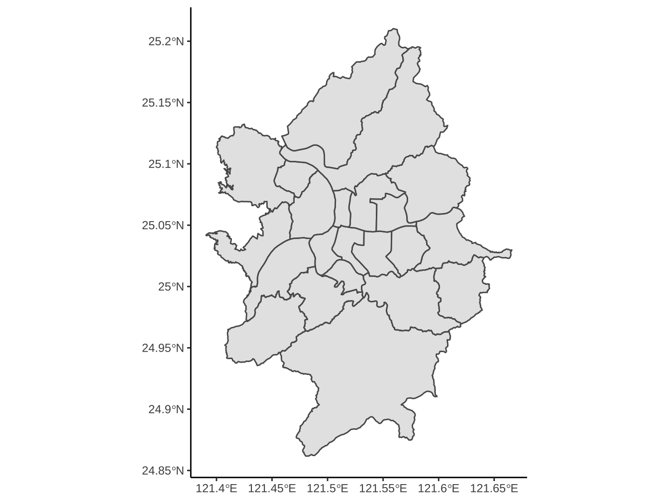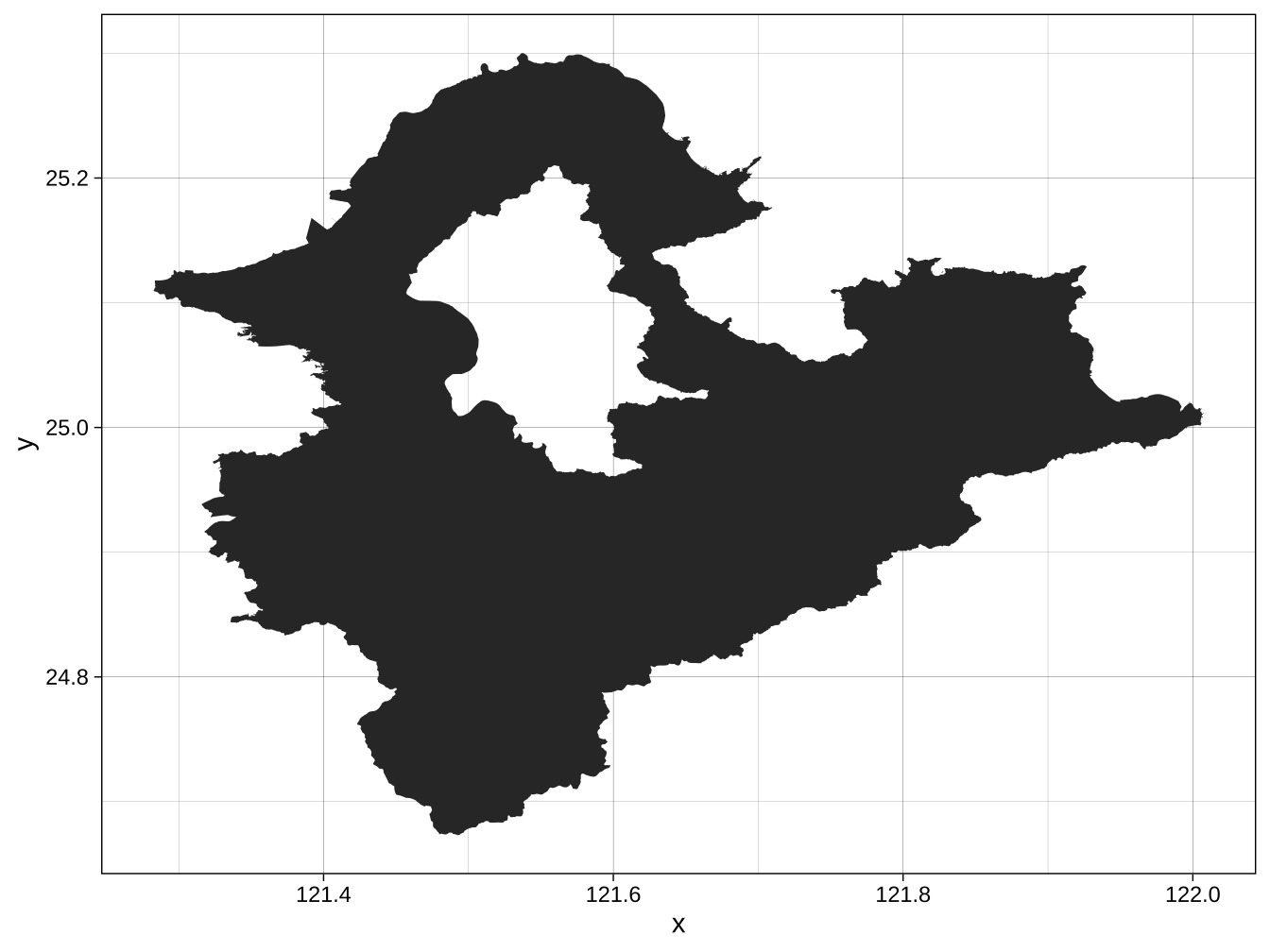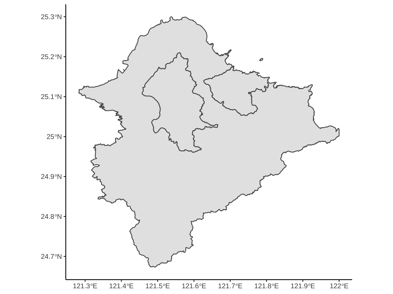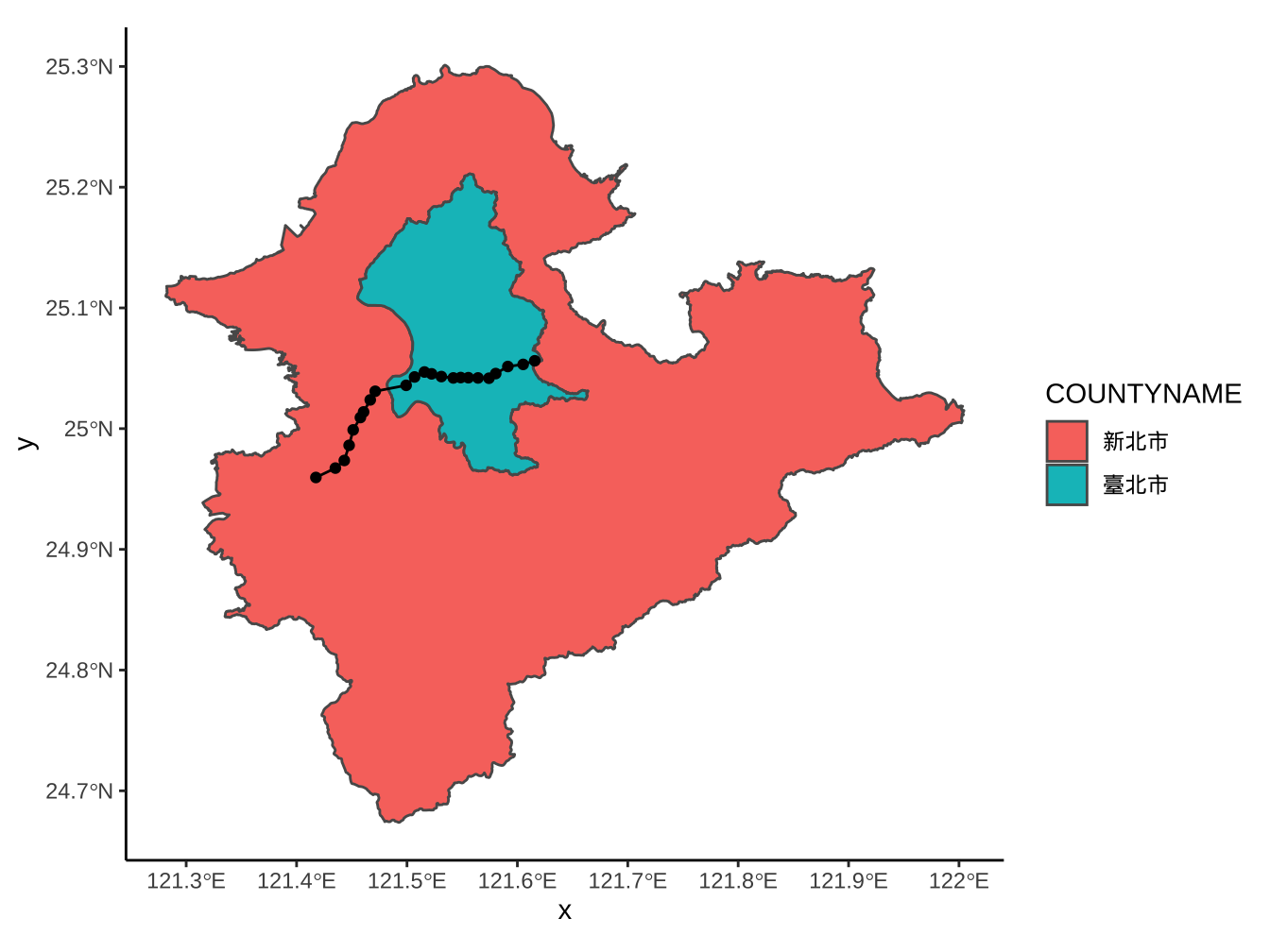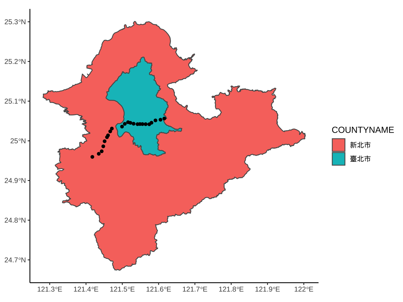 df_geo_northTW <- read_csv("https://www.dropbox.com/s/6uljw24zkyj7avs/df_geo_northTW.csv?dl=1")選出COUNTYNAME為“新北市”以geom_polygon繪出如下形狀: