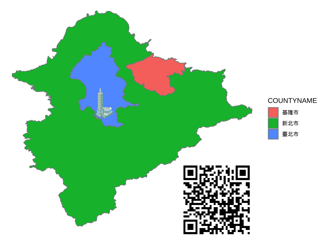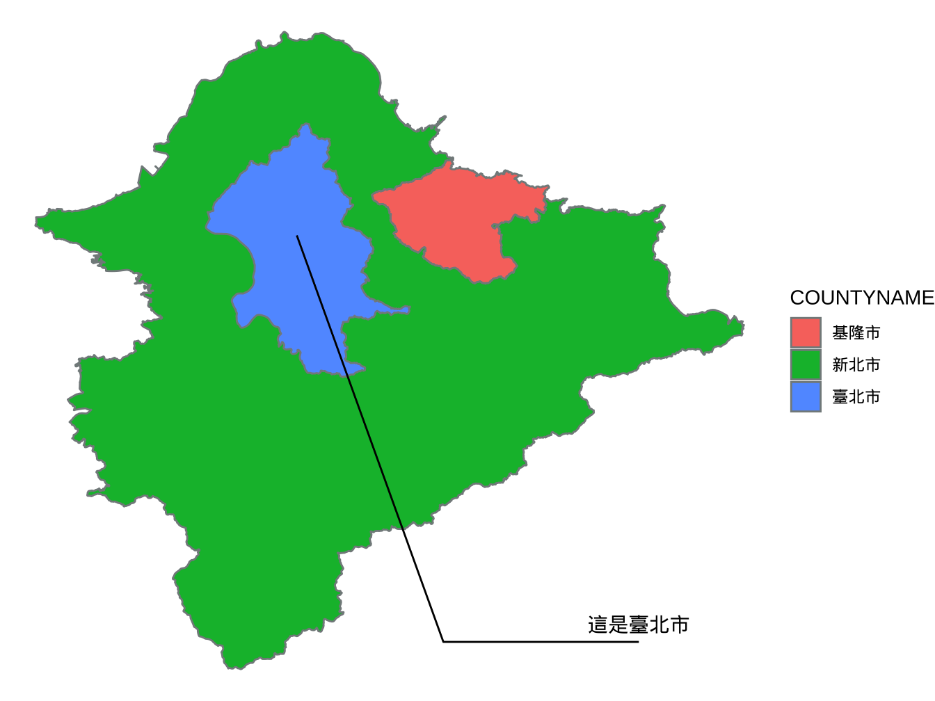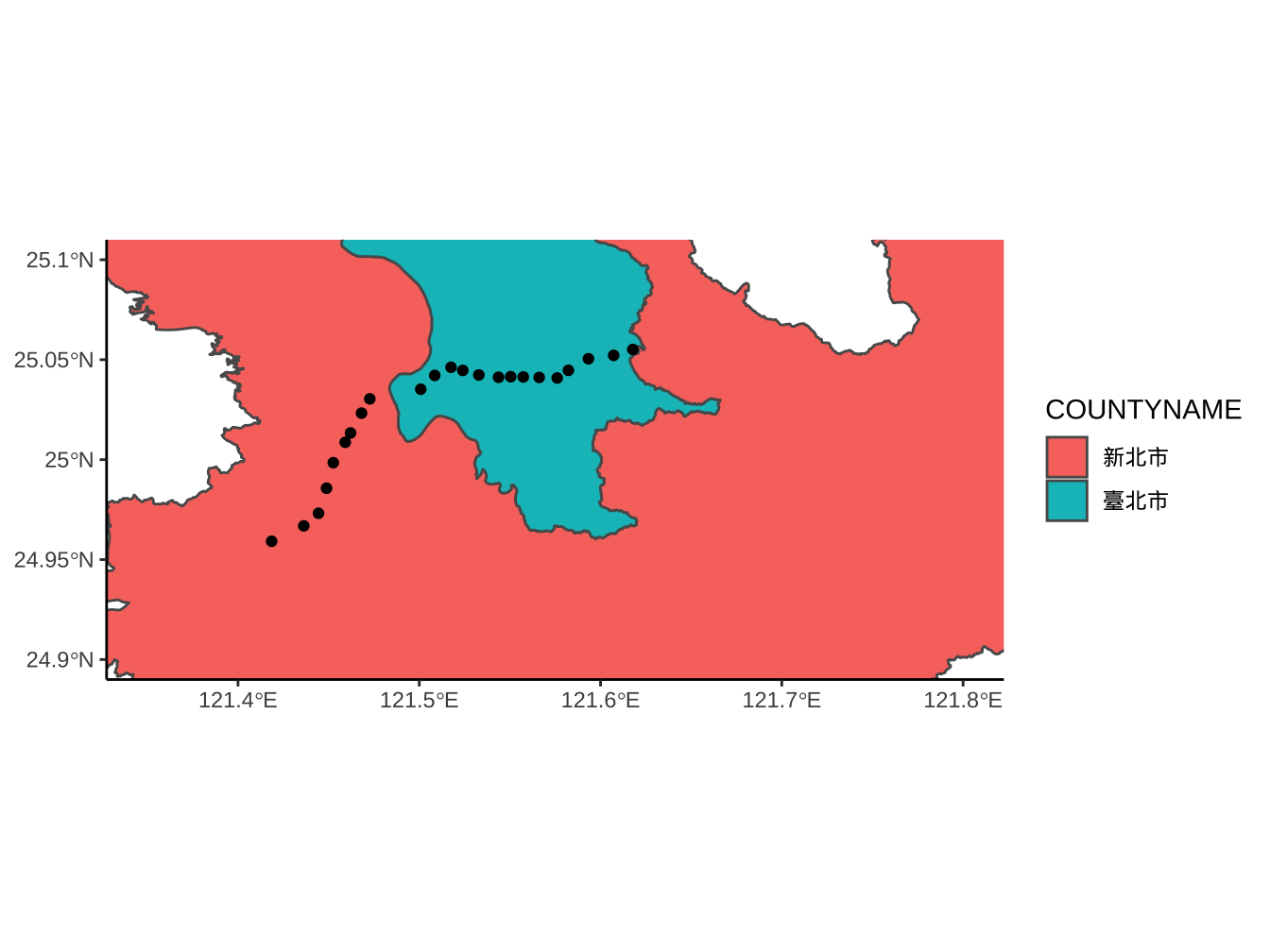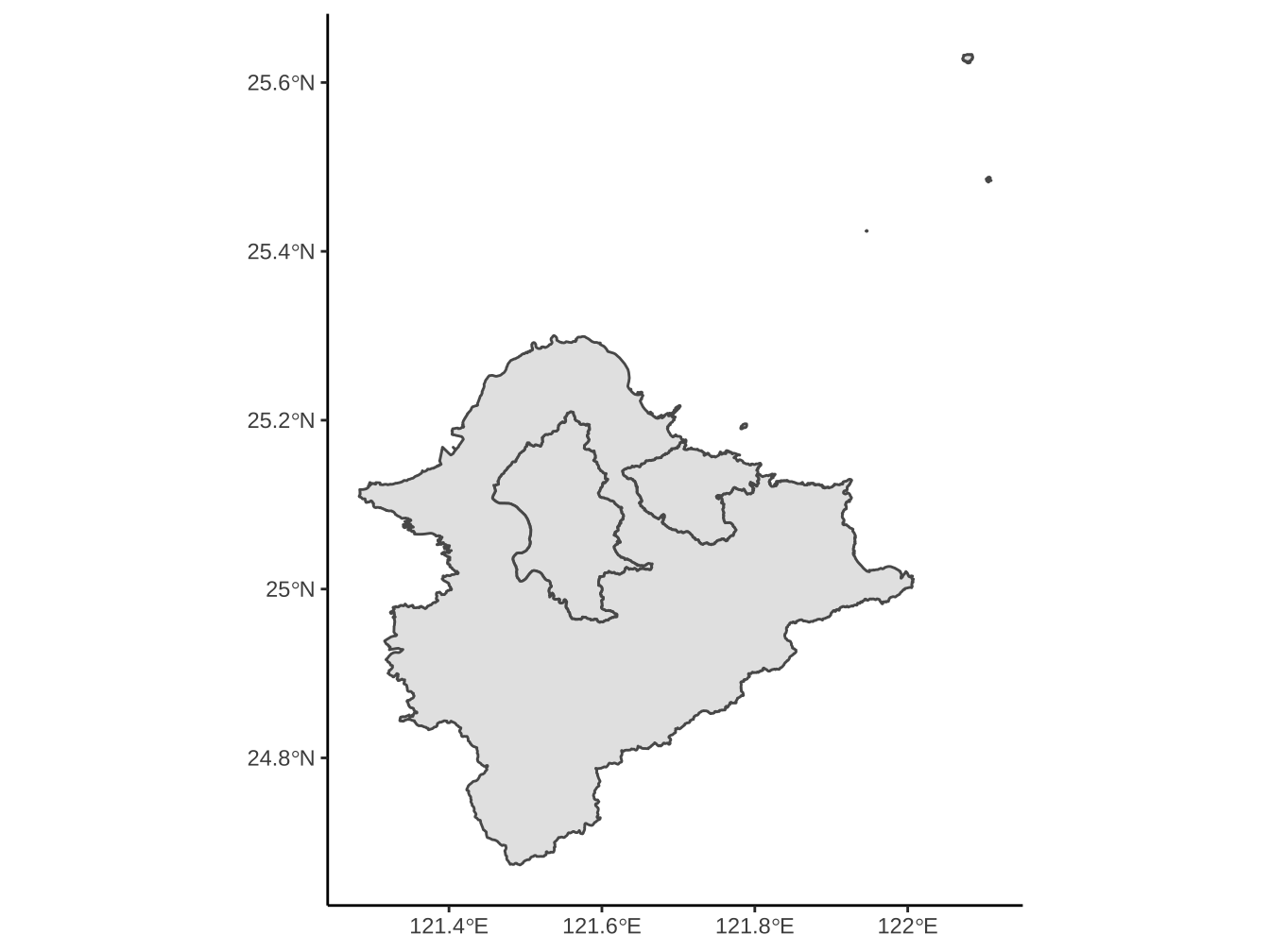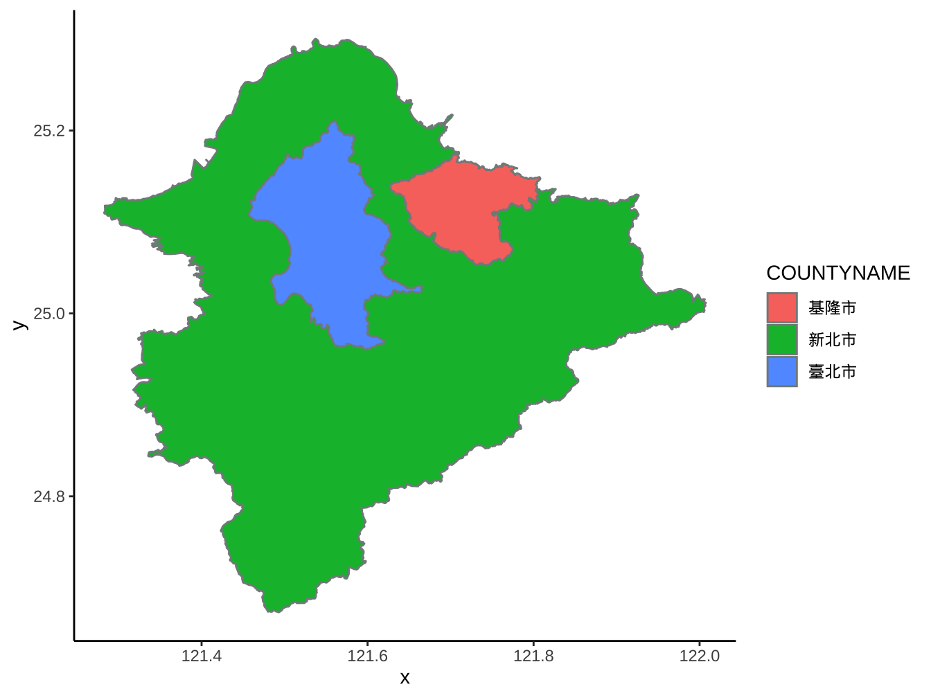 df_geo_northTW <- read_csv("https://www.dropbox.com/s/6uljw24zkyj7avs/df_geo_northTW.csv?dl=1")選出COUNTYNAME為“新北市”以geom_polygon繪出如下形狀: