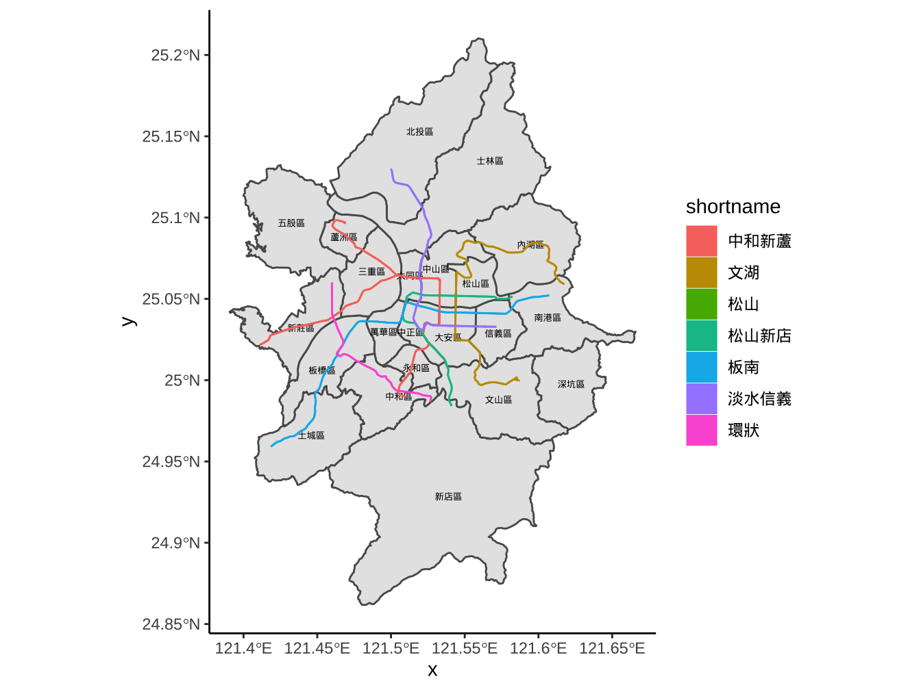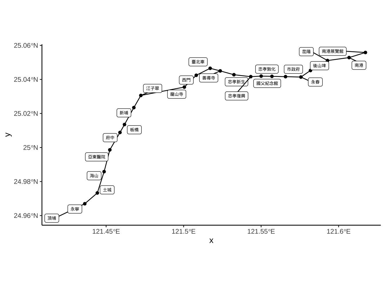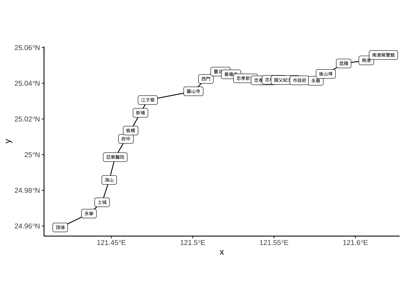 ) -> sf_tpe_mrt範例:將各個板南線片段連起來(使用st_union())