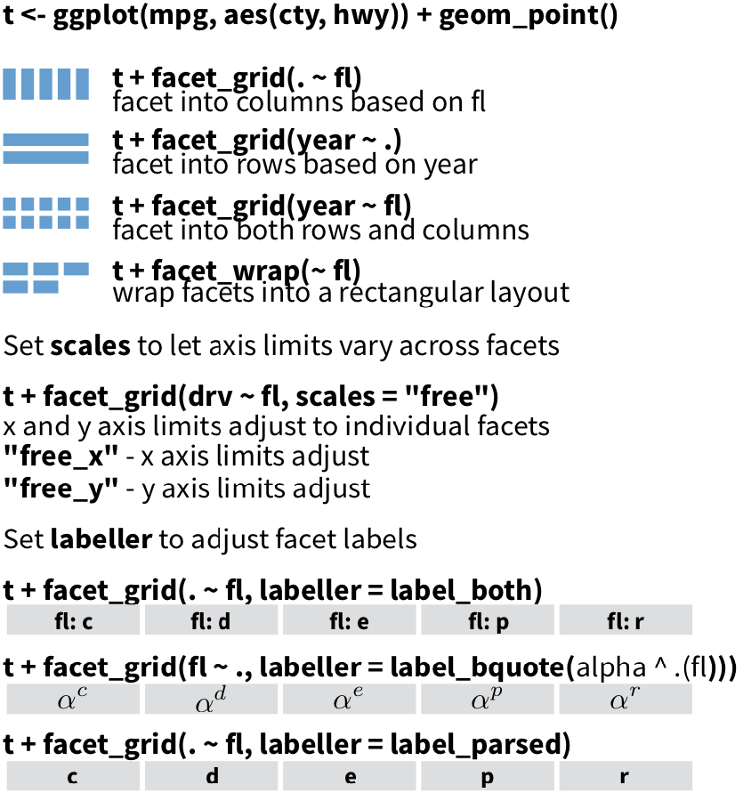- scales: Are scales shared across all facets (the default, “fixed”), or do they vary across rows (“free_x”), columns (“free_y”), or both rows and columns (“free”)?