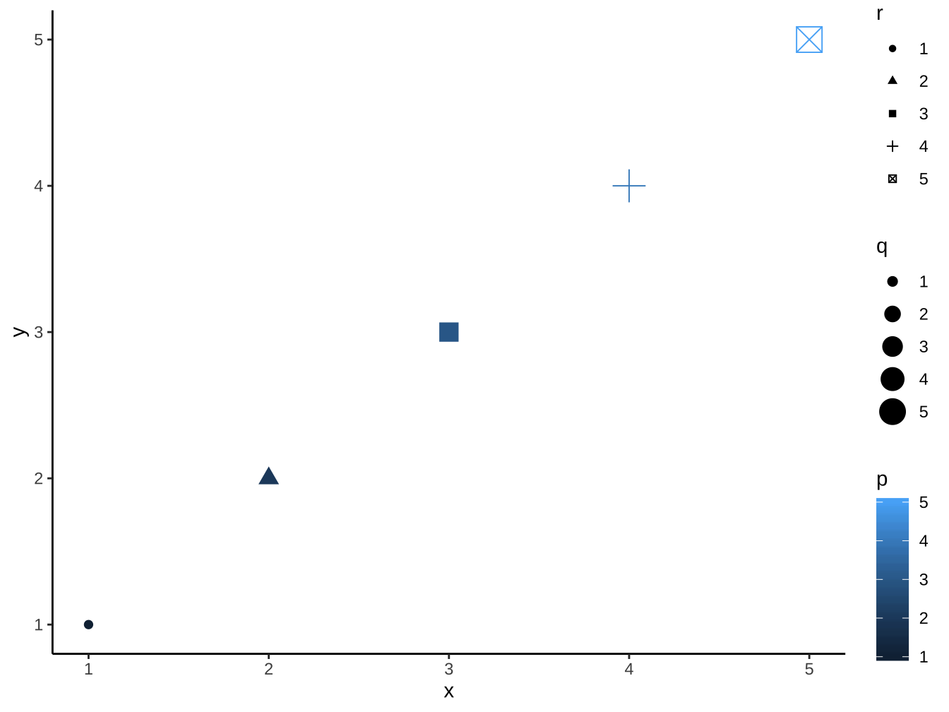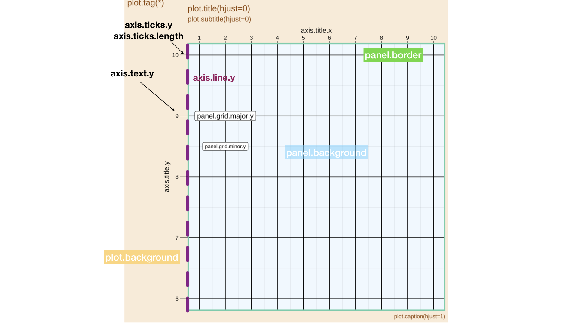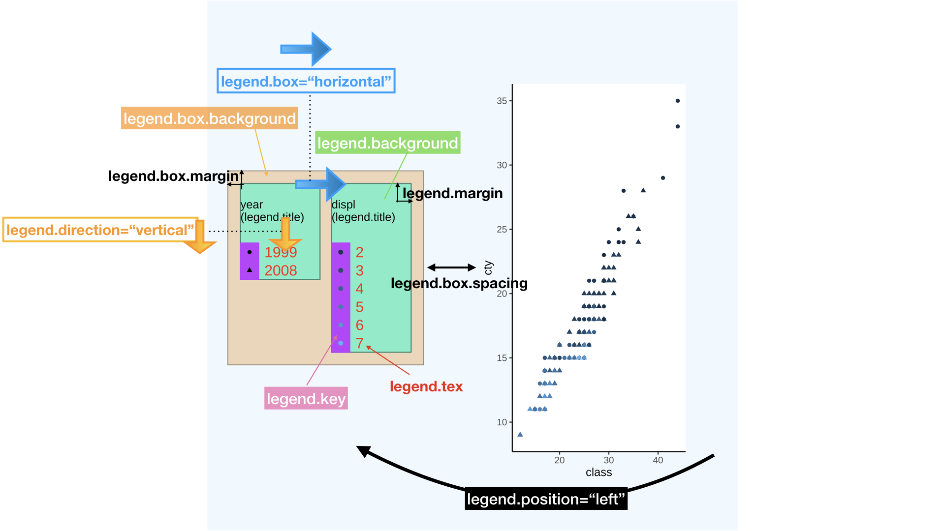 Guides: 圖形aes mapping說明。主要由座標軸(axes)及圖例(legend)使讀者易於理解aes mapping關係,其設計更動主要透過下面兩個layers: