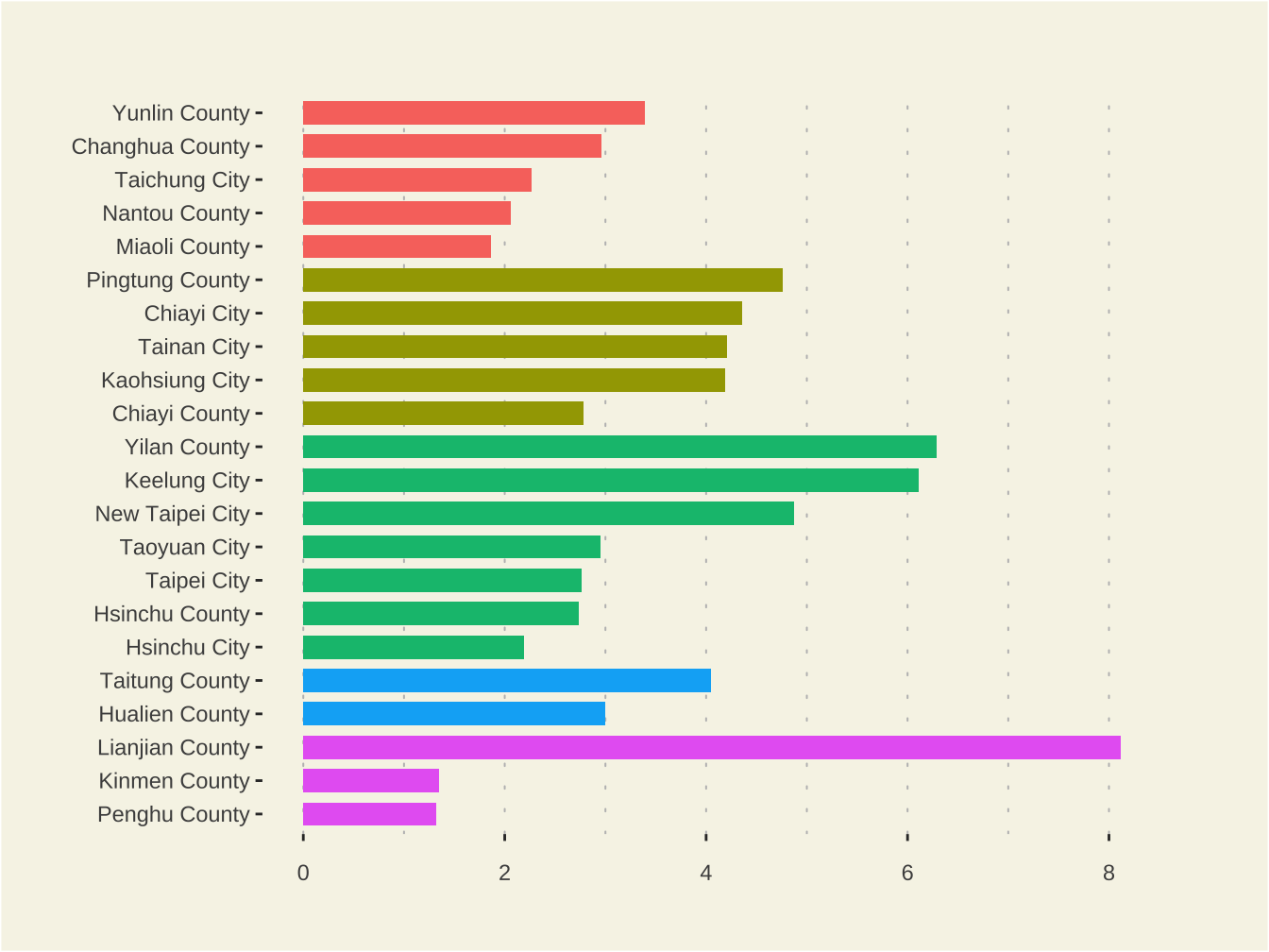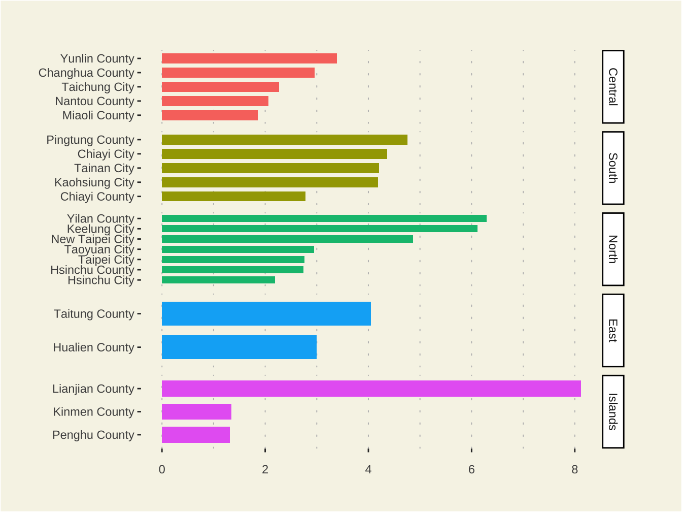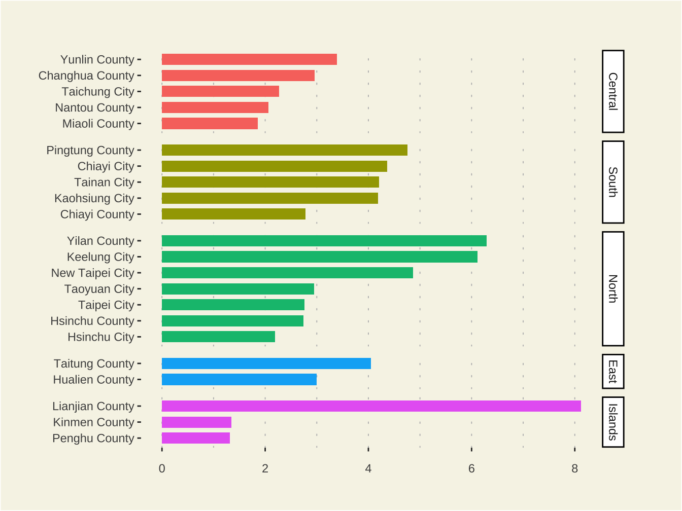 labs(x = "長照機構數(每10,000位老人)", y="")+
