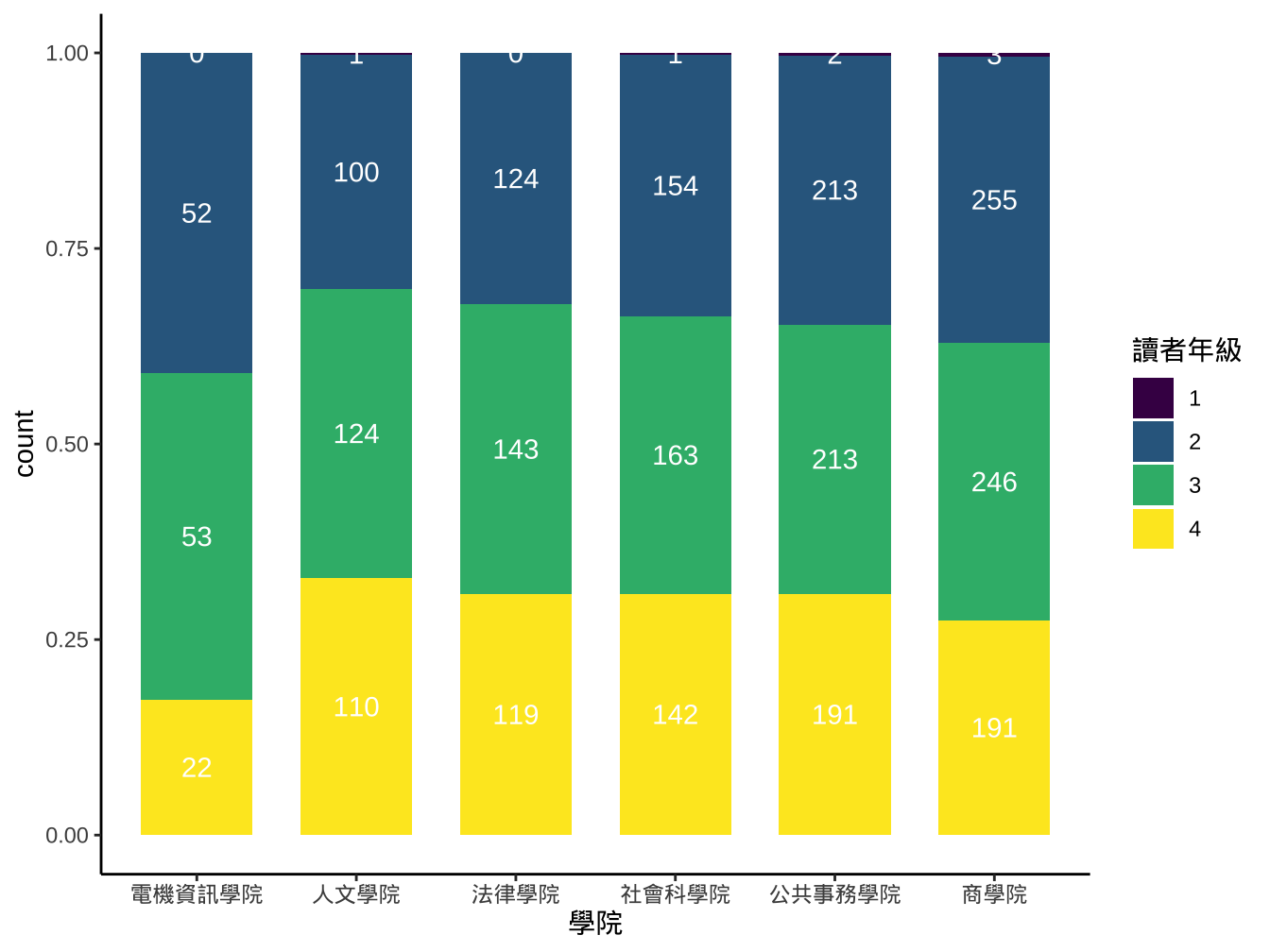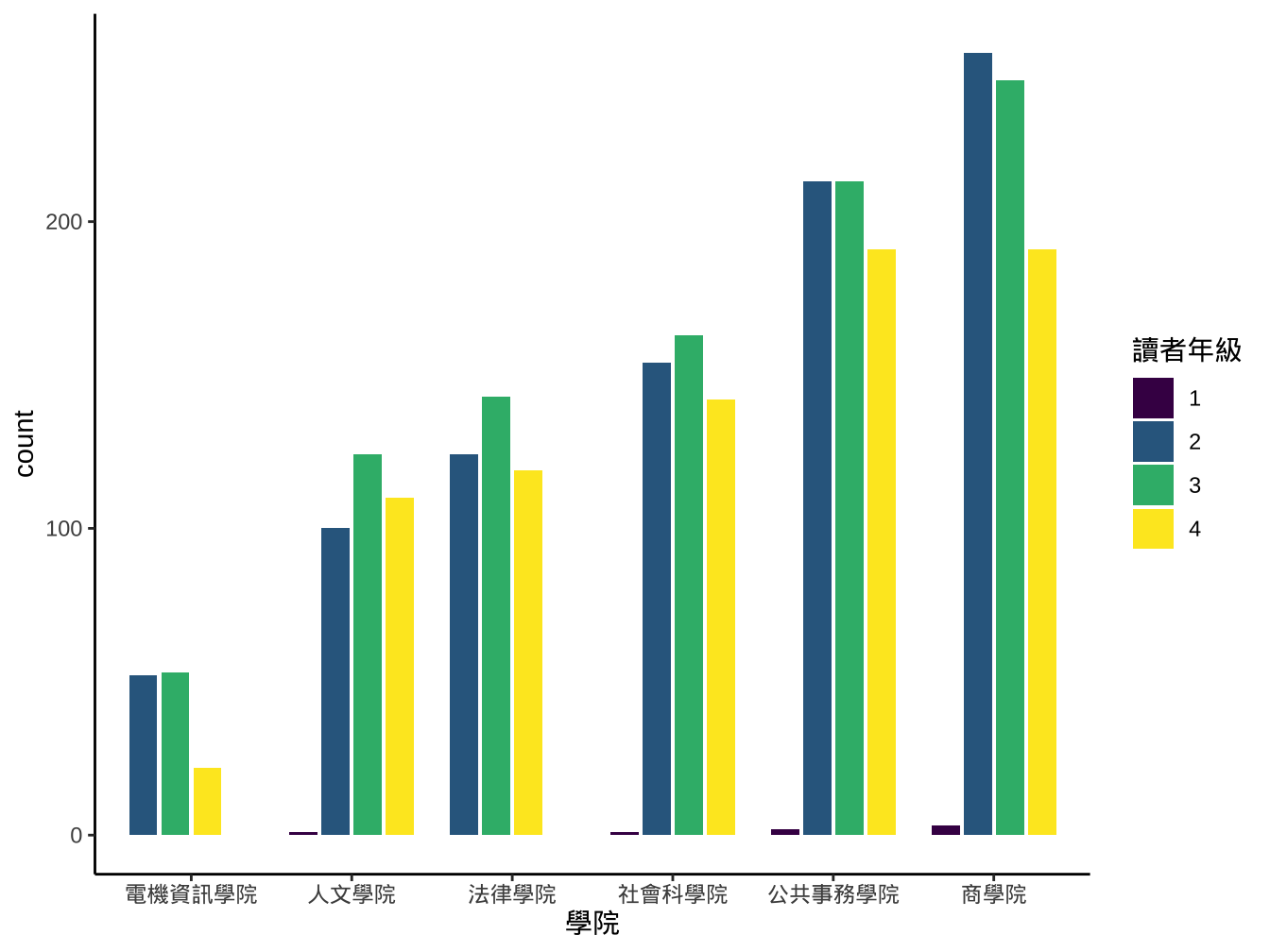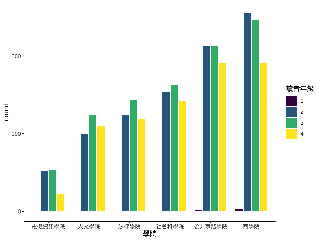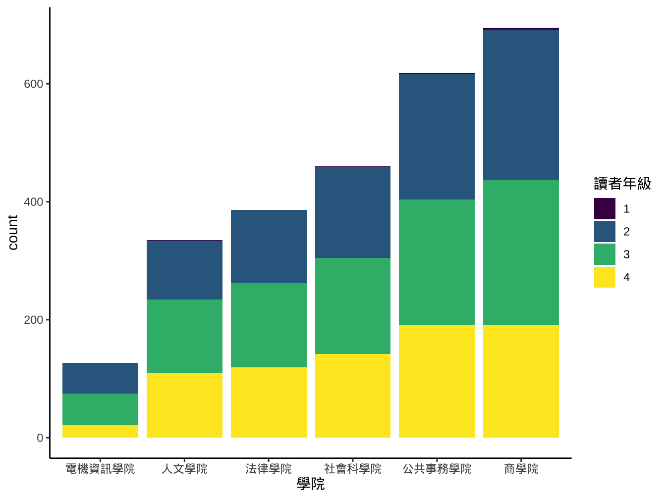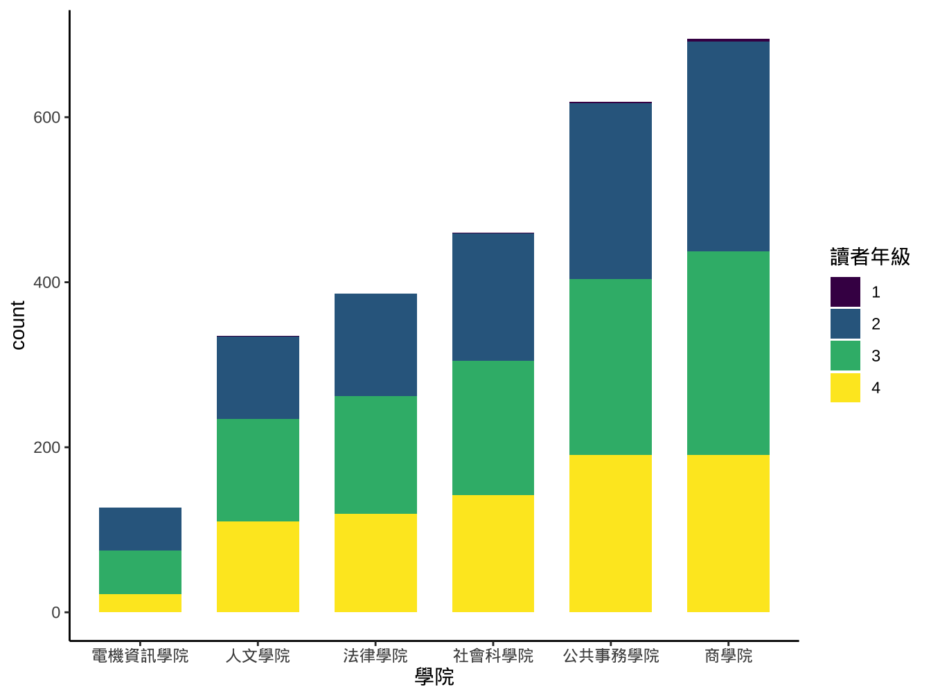 ggplot(aes(x=學院,fill=讀者年級)) -> graphList$圖書_ggplotOnly_with_aes2