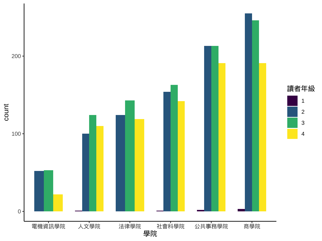 ggplot(aes(x=學院,fill=讀者年級)) -> graphList$圖書_ggplotOnly_with_aes