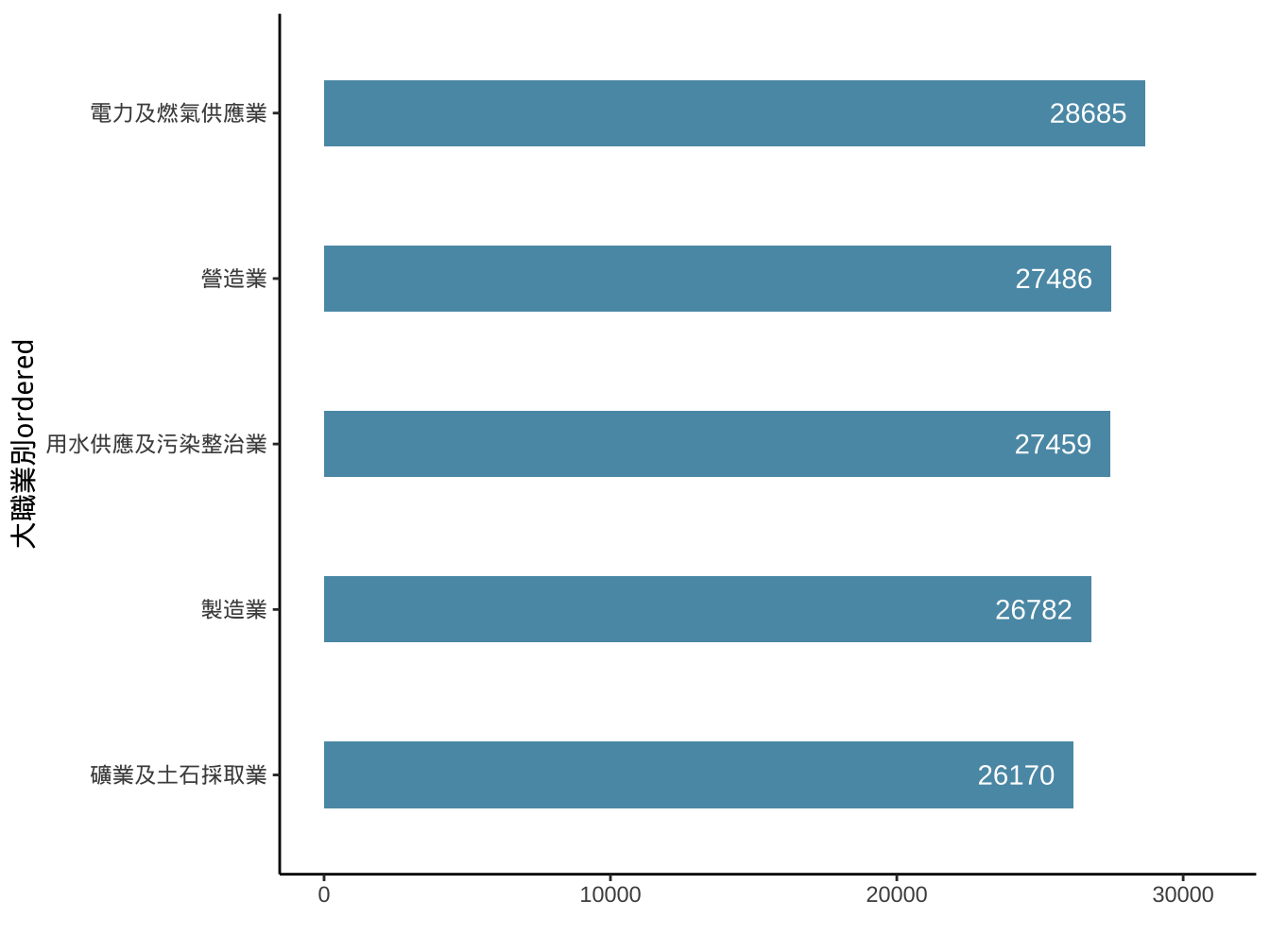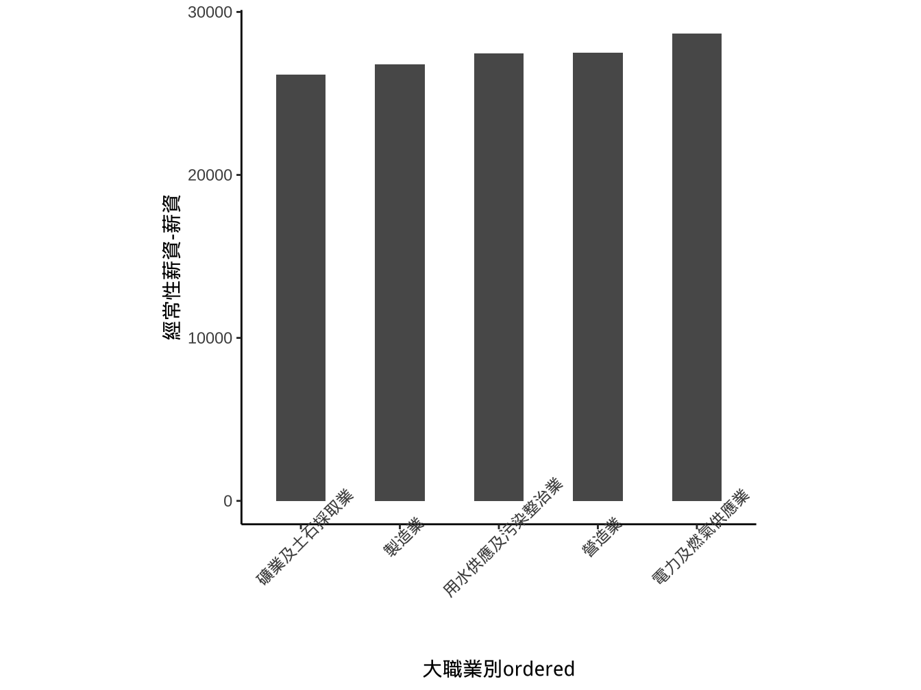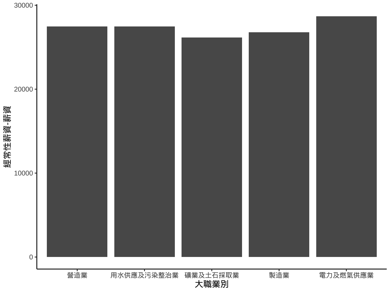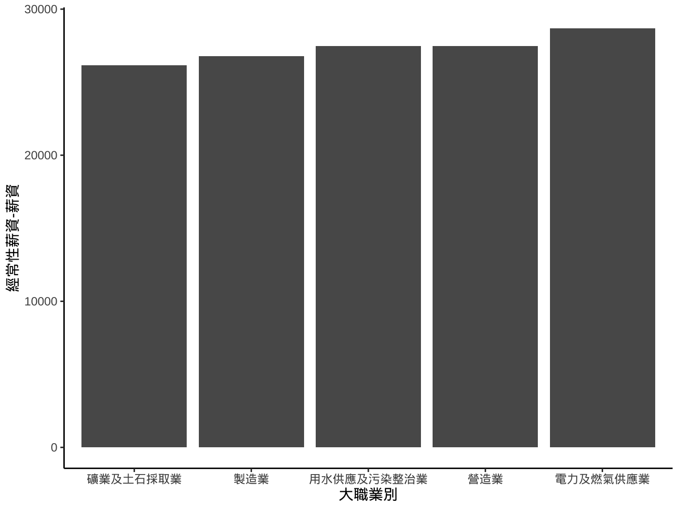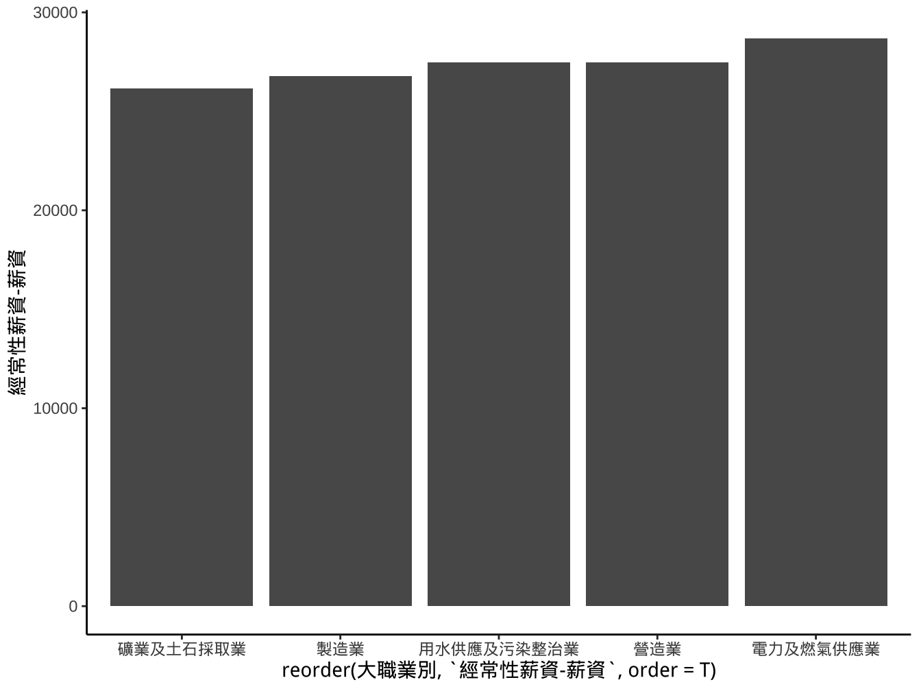 aes(x=reorder(大職業別,`經常性薪資-薪資`,order = T),y=`經常性薪資-薪資`)