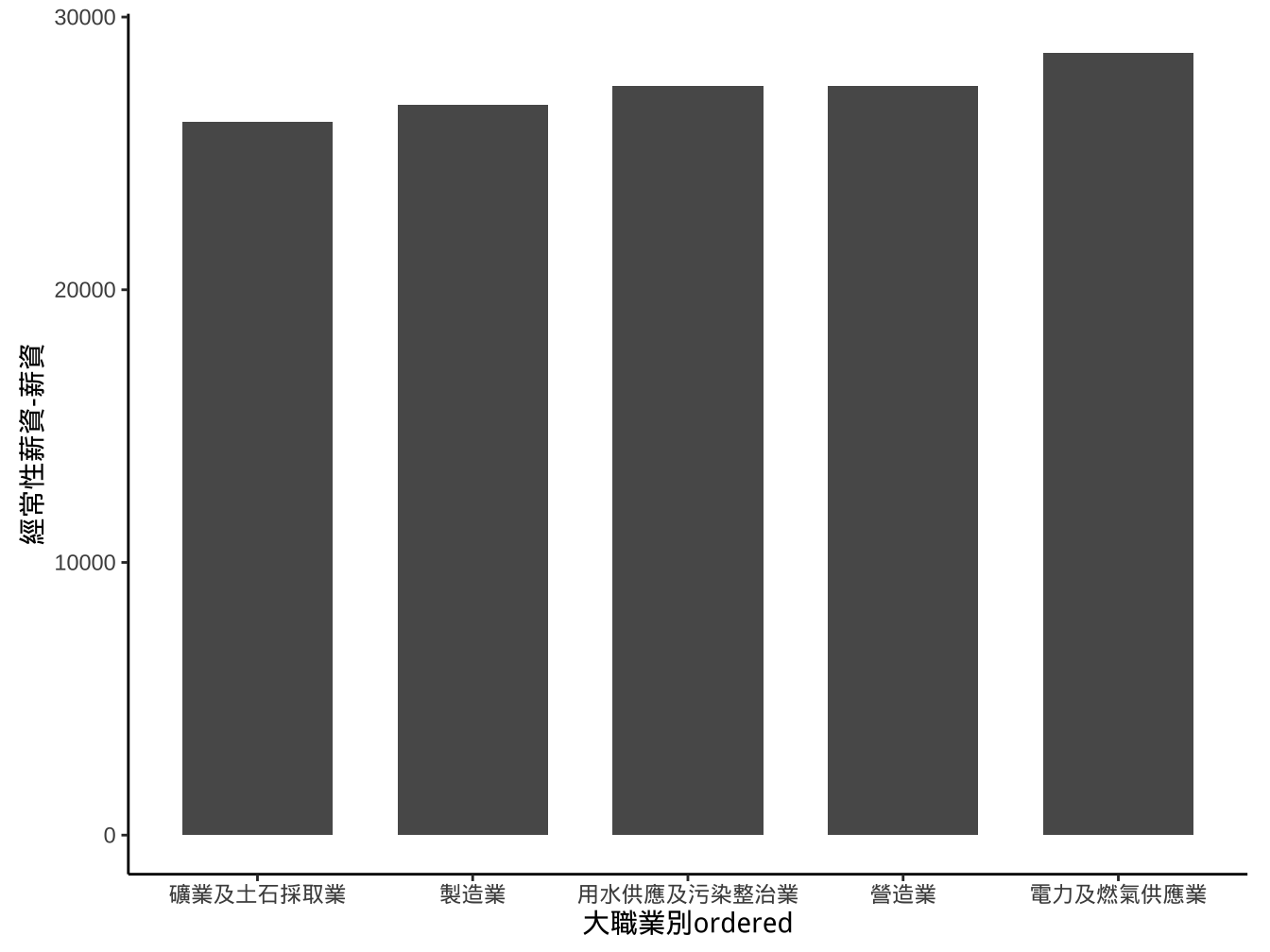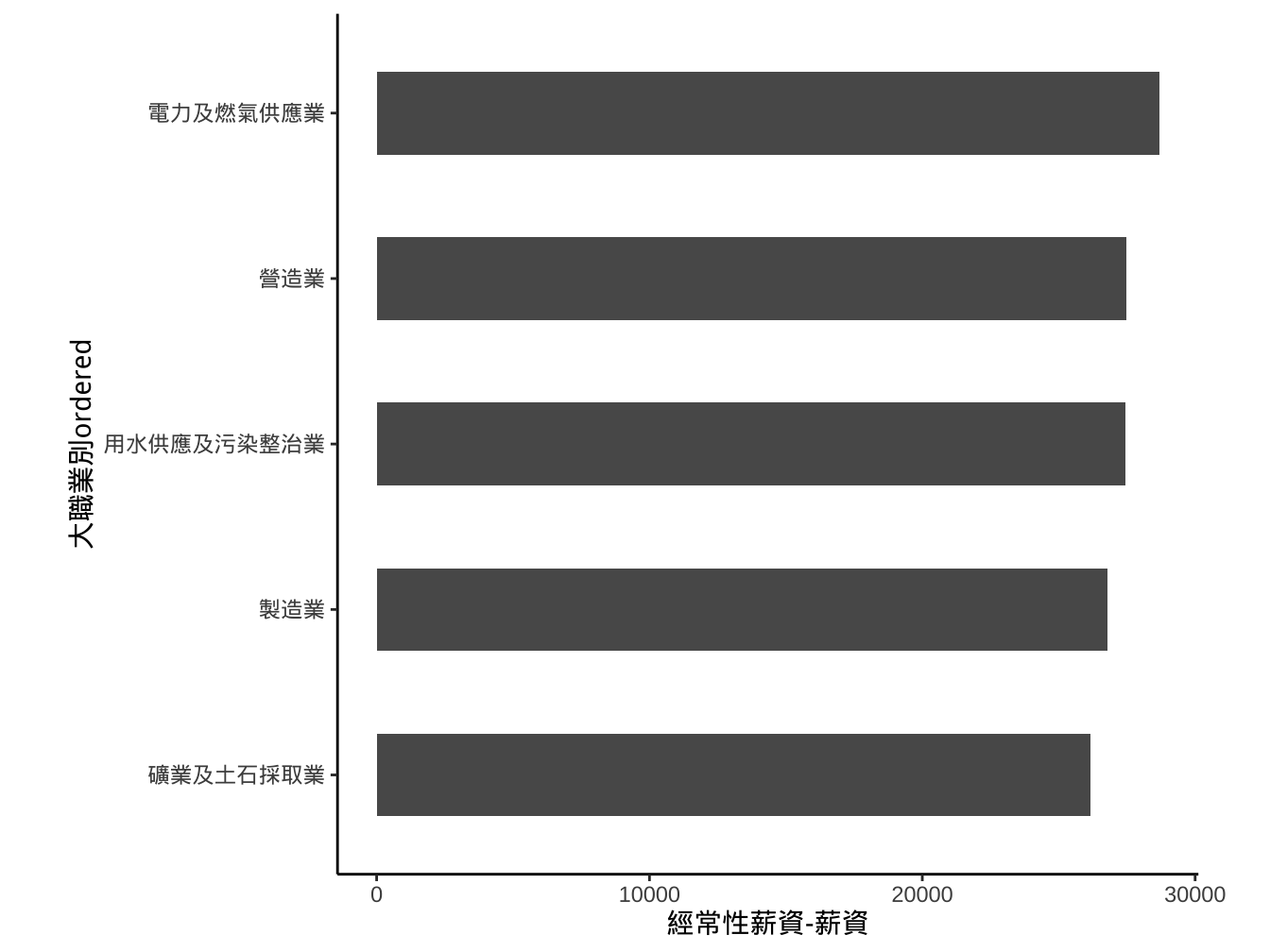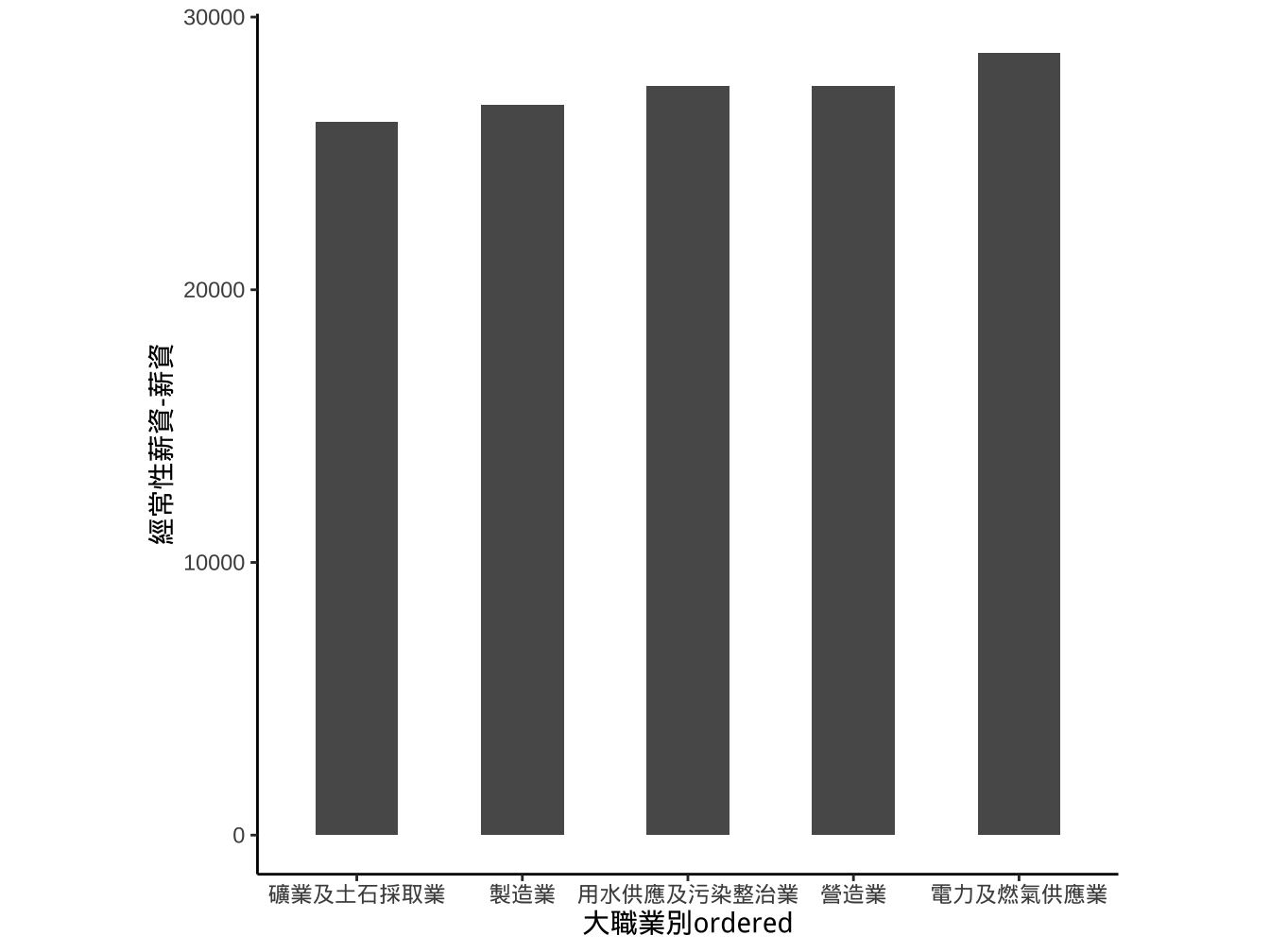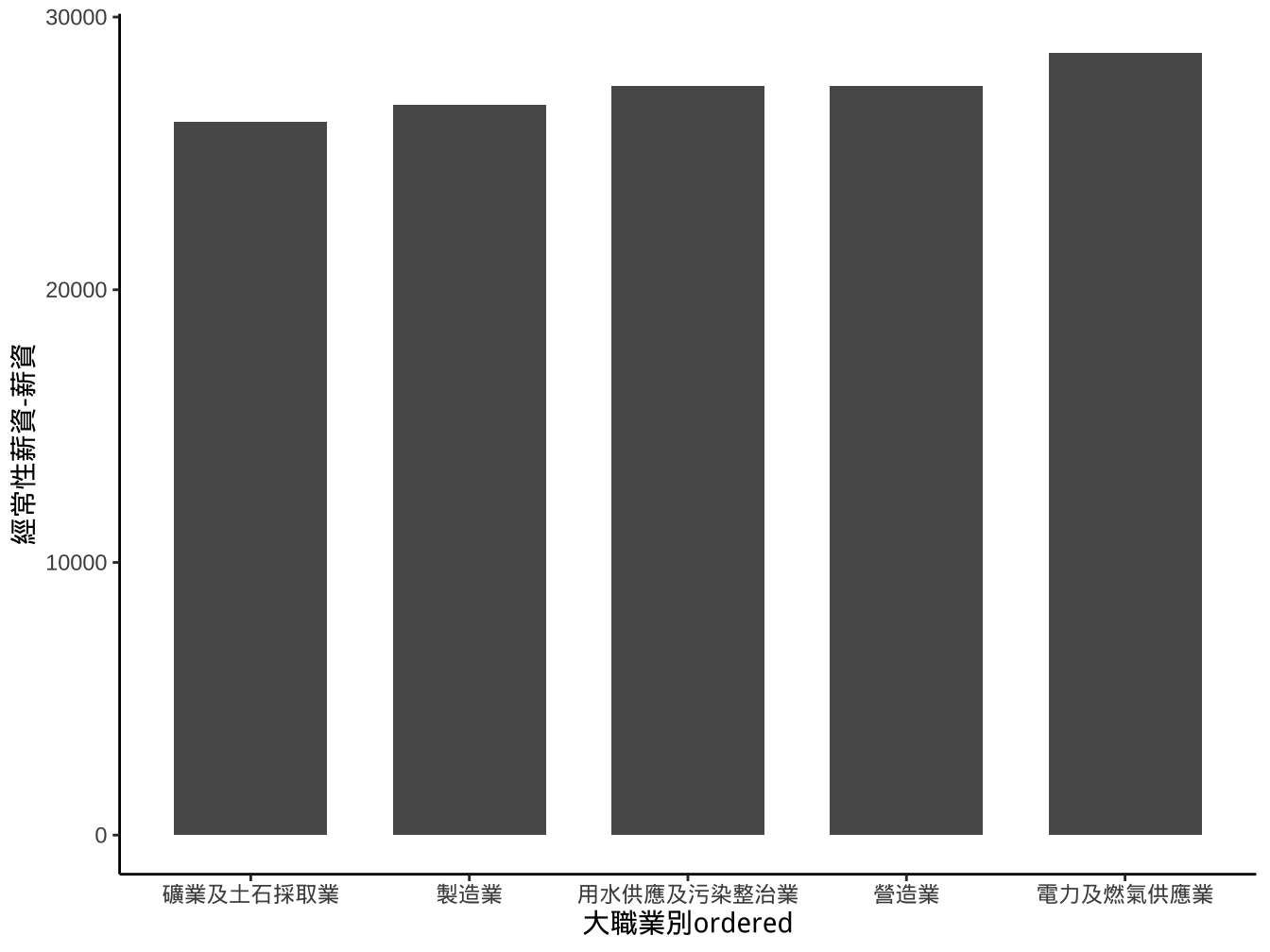 - 作法1: 將大職業別改成facotr, 其levels以經常性薪資-薪資排序。