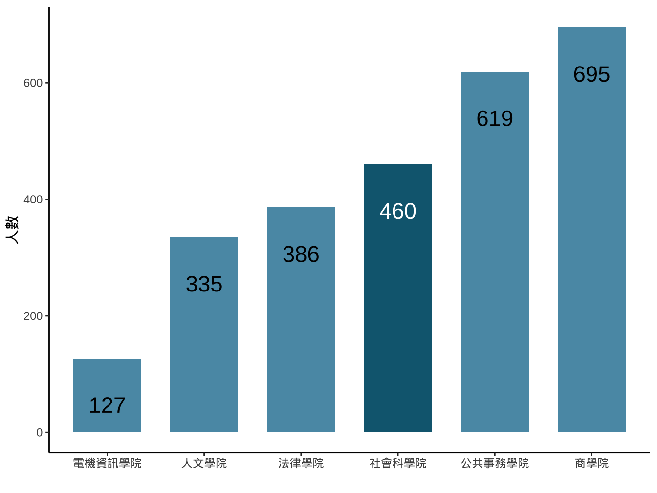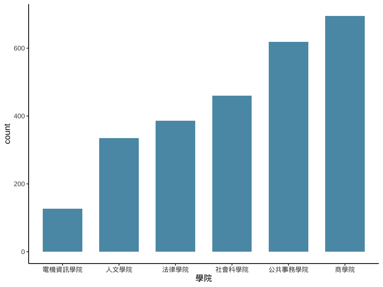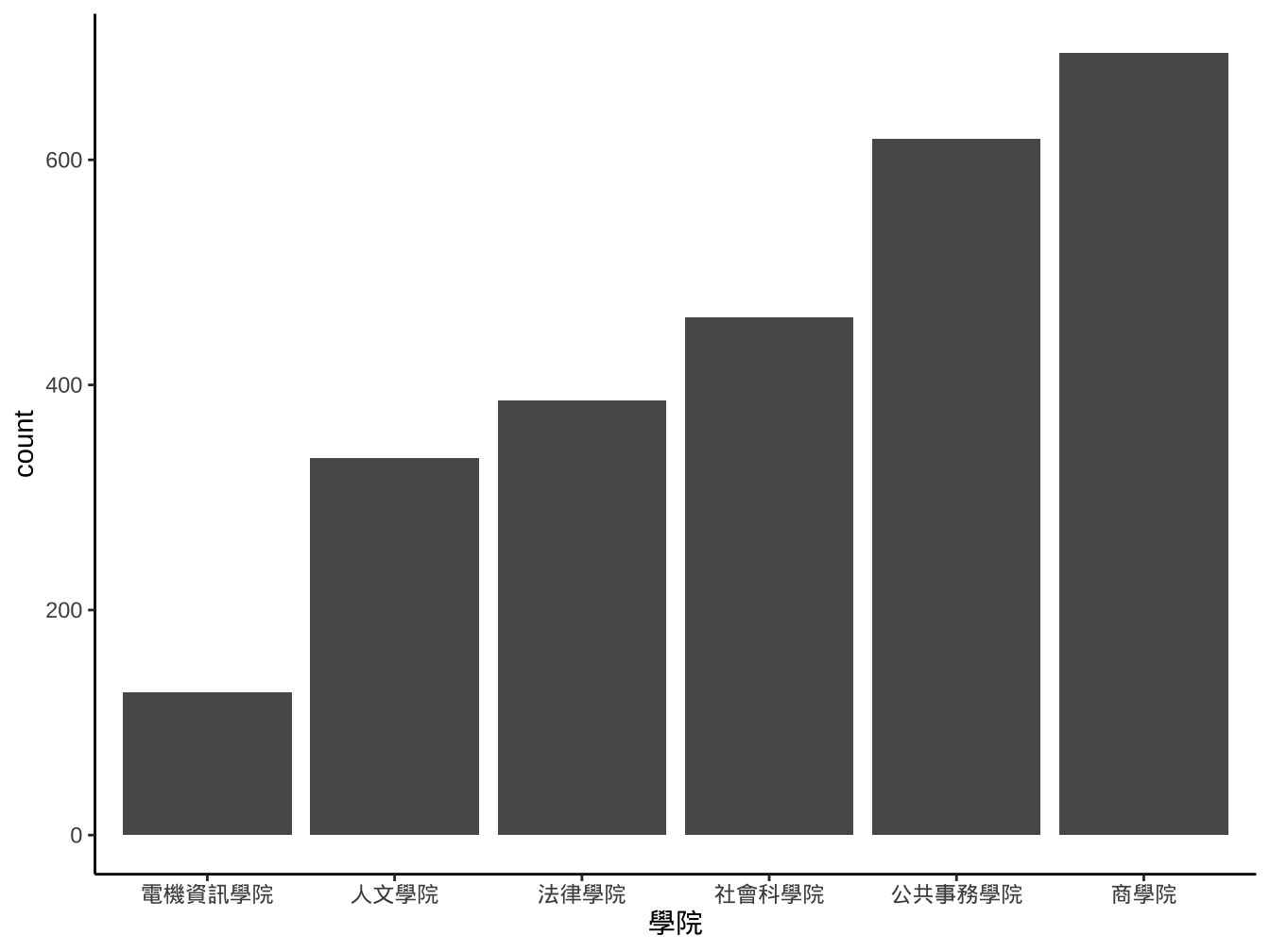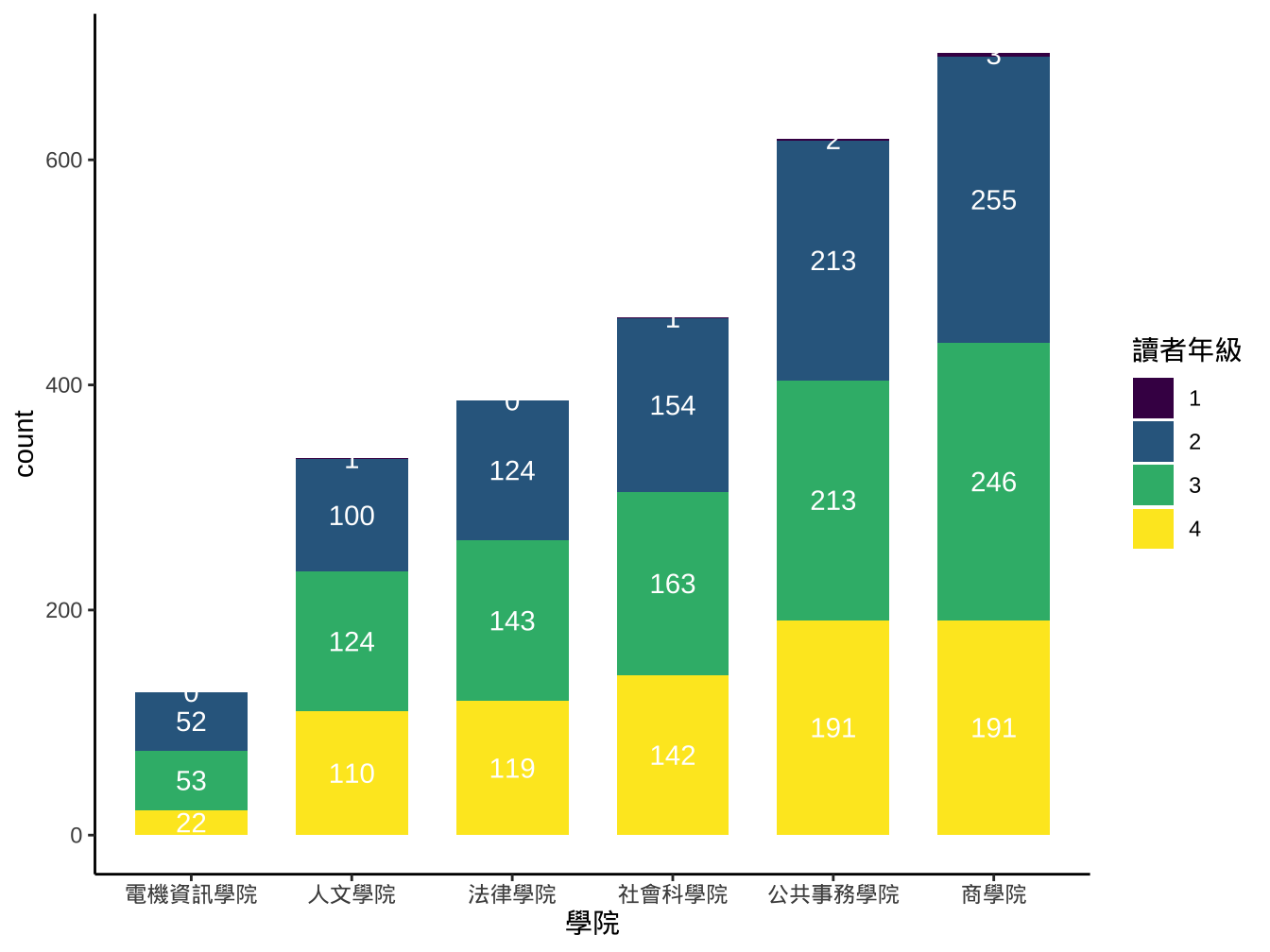 電機、法律學院沒有1年級資料,count時會少一類並不會計0,造成圖面的不一致。此時建議自行count並以stat=“identity”方式作圖: