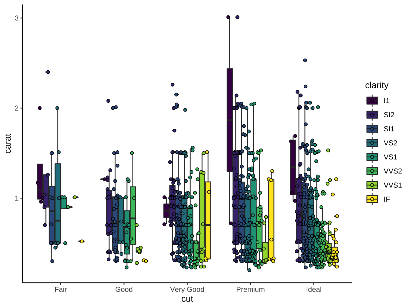 ggplot(dsub, aes(x = cut, y = carat, fill = clarity)) +