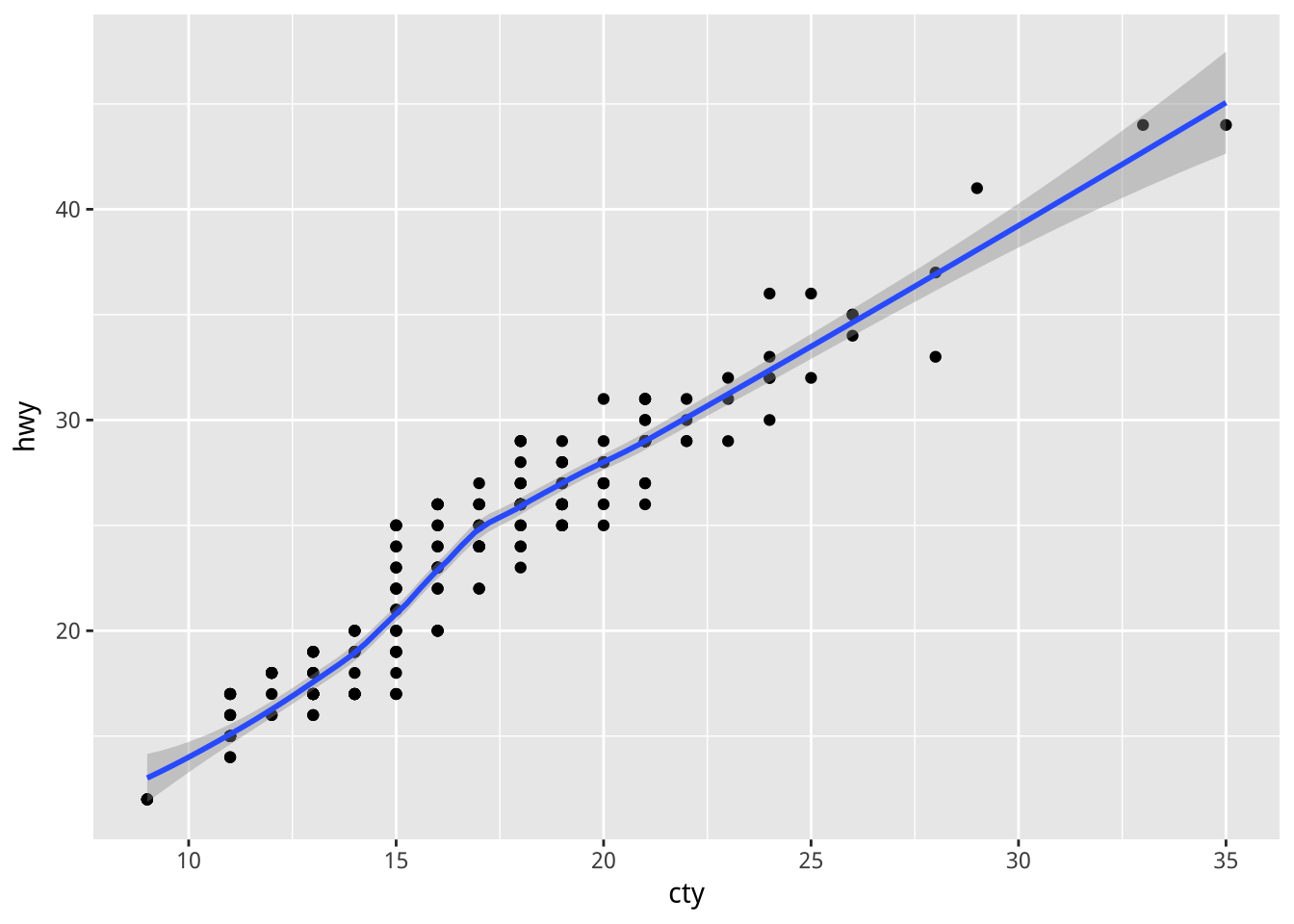 e2 + geom_point(mapping=aes(cty, hwy),data=mpg)+