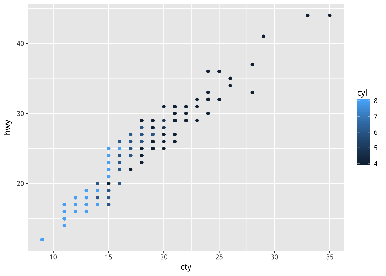 geom_point(aes(x=cty,y=hwy,color=cyl))