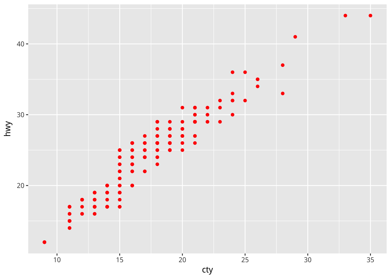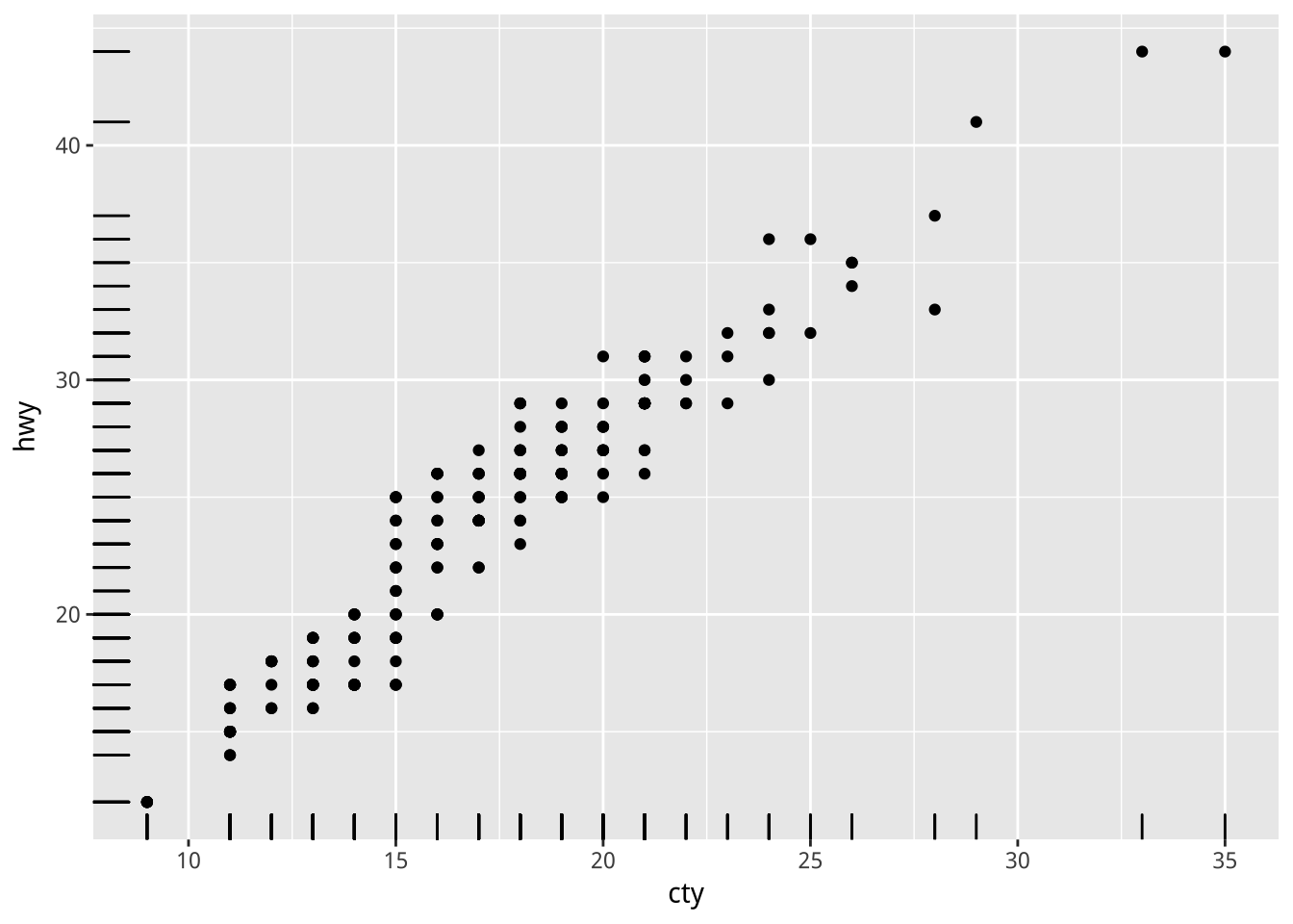 e2 + geom_point(mapping=aes(cty, hwy),data=mpg)