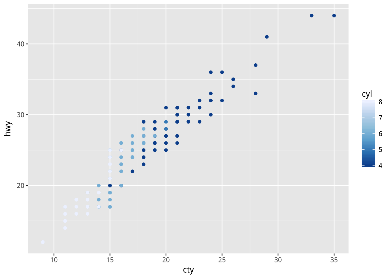 geom_point(aes(x=cty,y=hwy,color=cyl))+