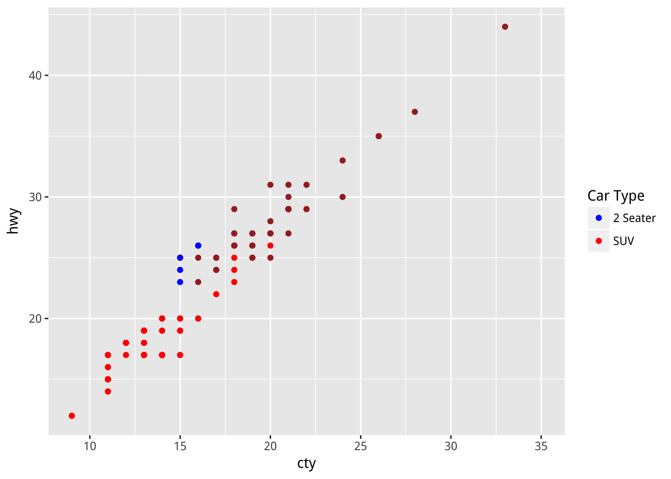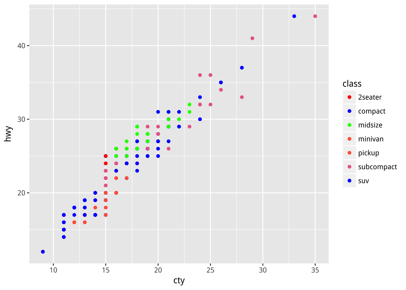 geom_point(aes(x=cty,y=hwy,color=class))