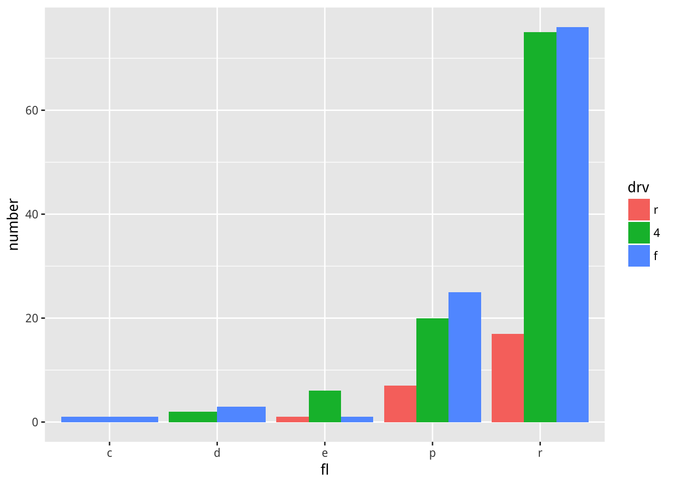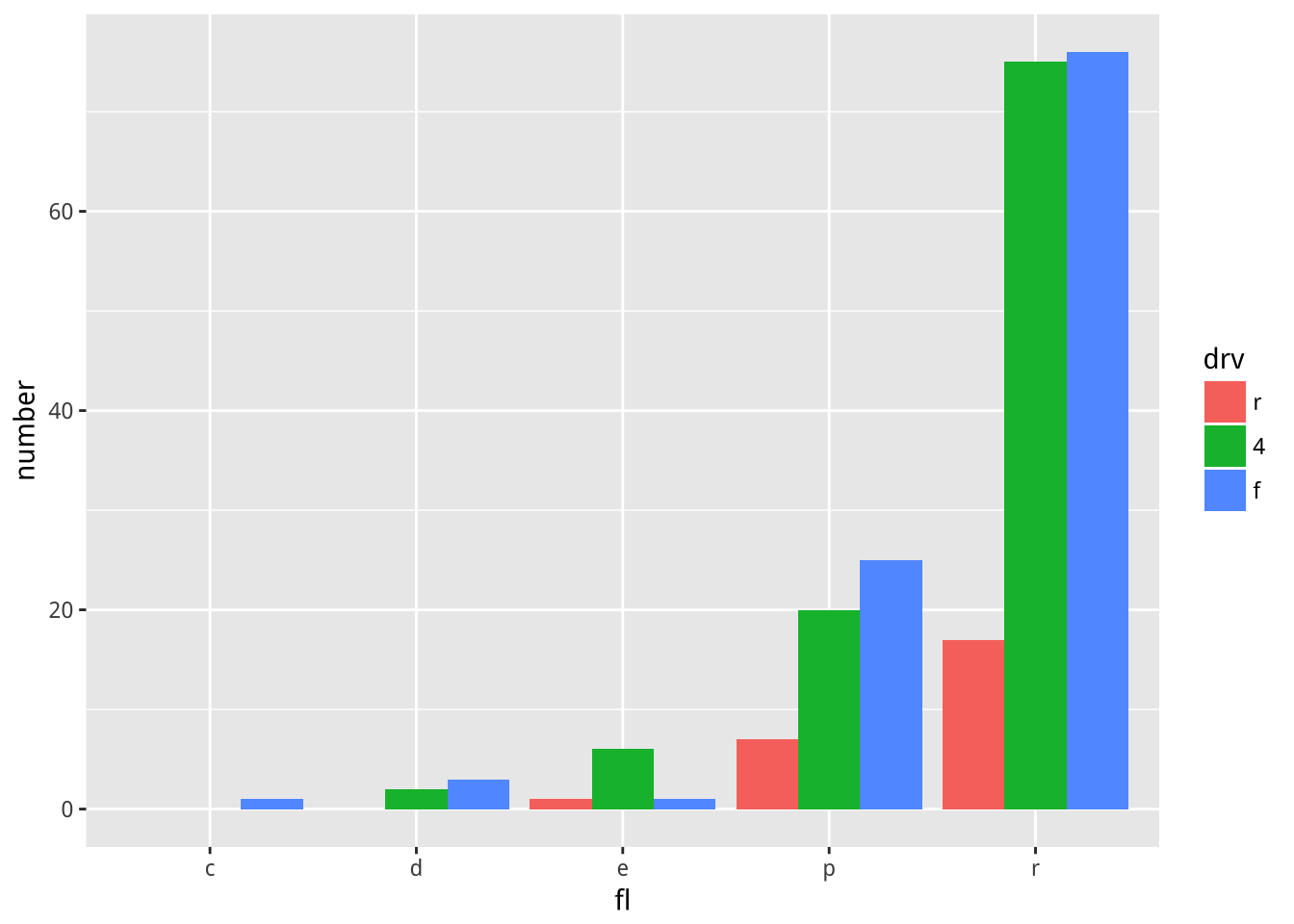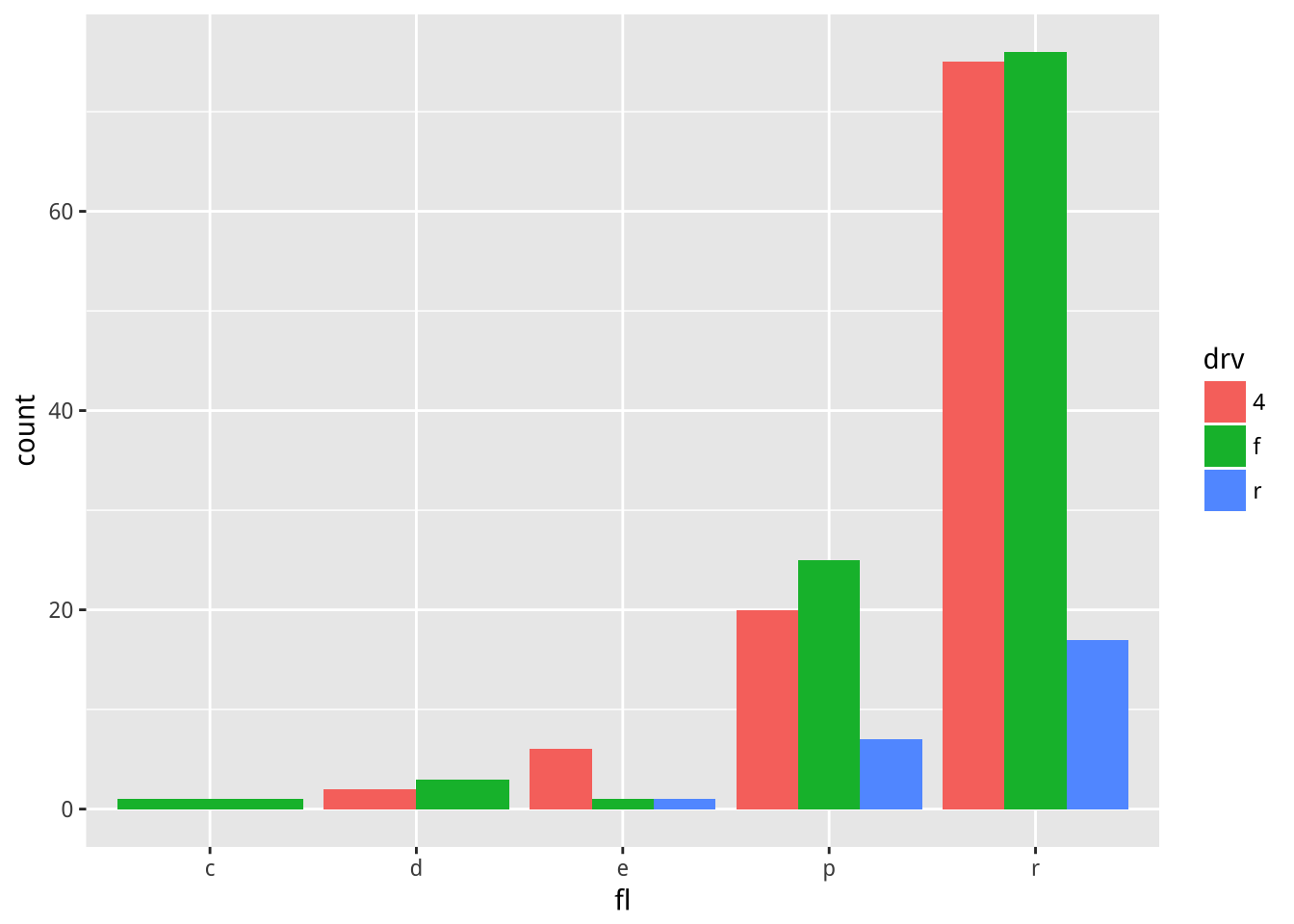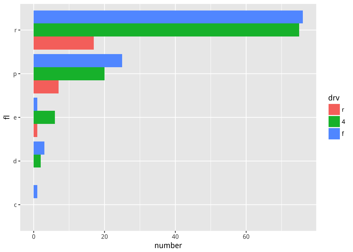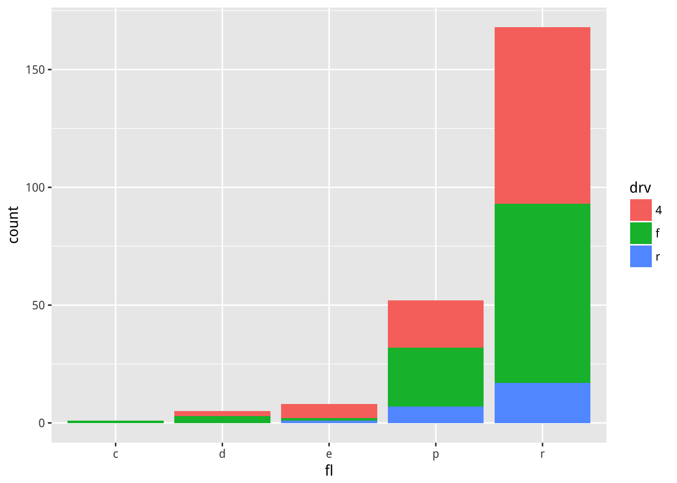 mpg2$drv %>% ordered(levels=c("r","4","f")) -> mpg2$drvs <- ggplot(mpg2, aes(fl, fill = drv))
