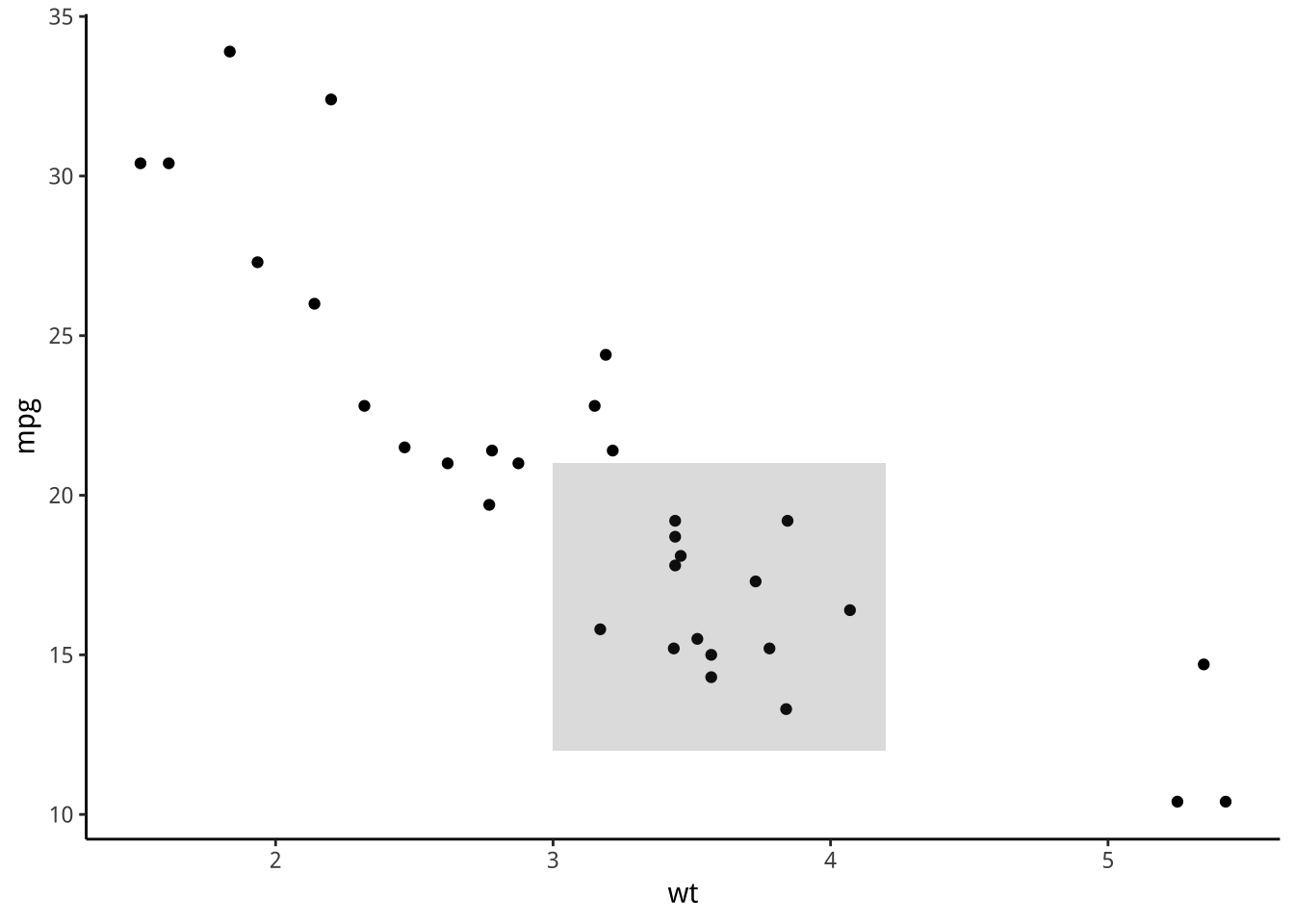 p + annotate("rect", xmin = 3, xmax = 4.2, ymin = 12, ymax = 21,