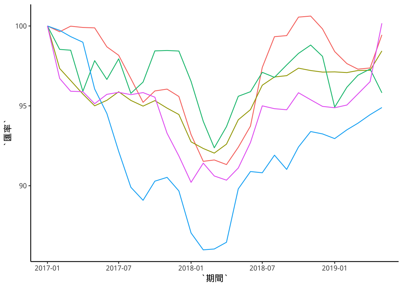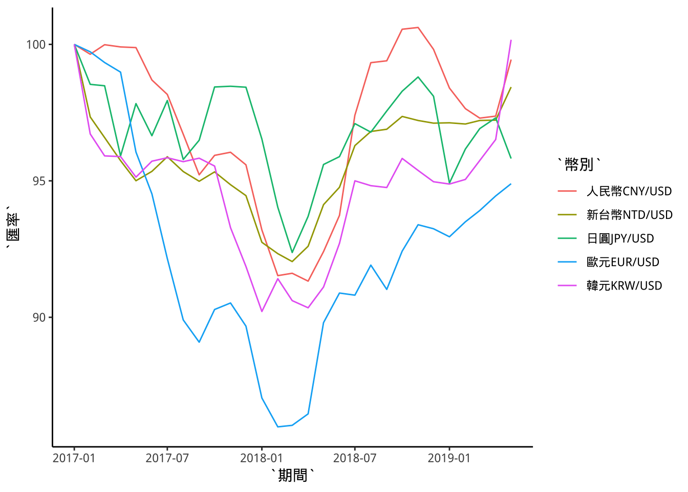 mutate(匯率=匯率/匯率[期間==ymd("2017-01-01")]*100) %>%