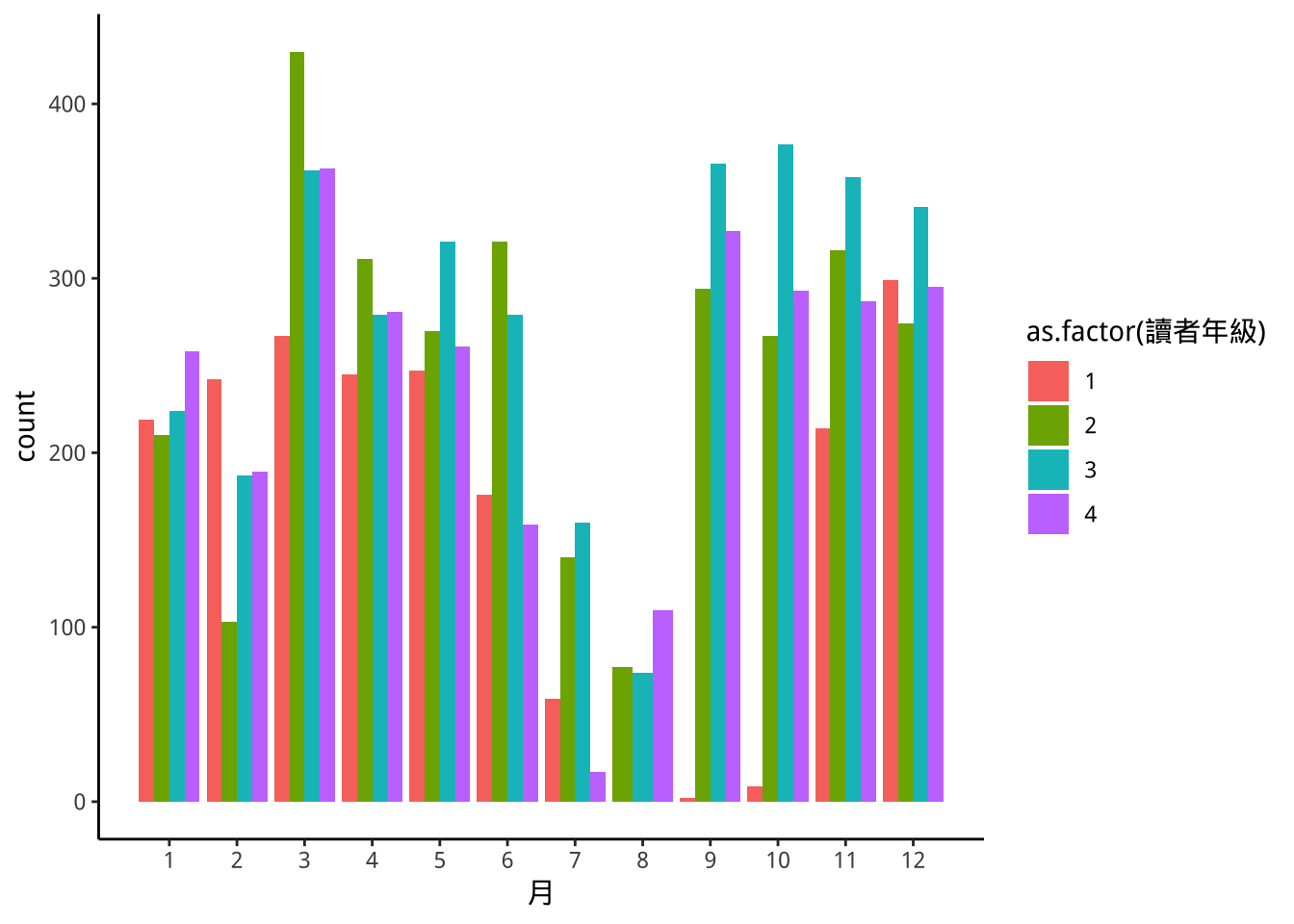ggplot(aes(x=as.factor(讀者年級)))+