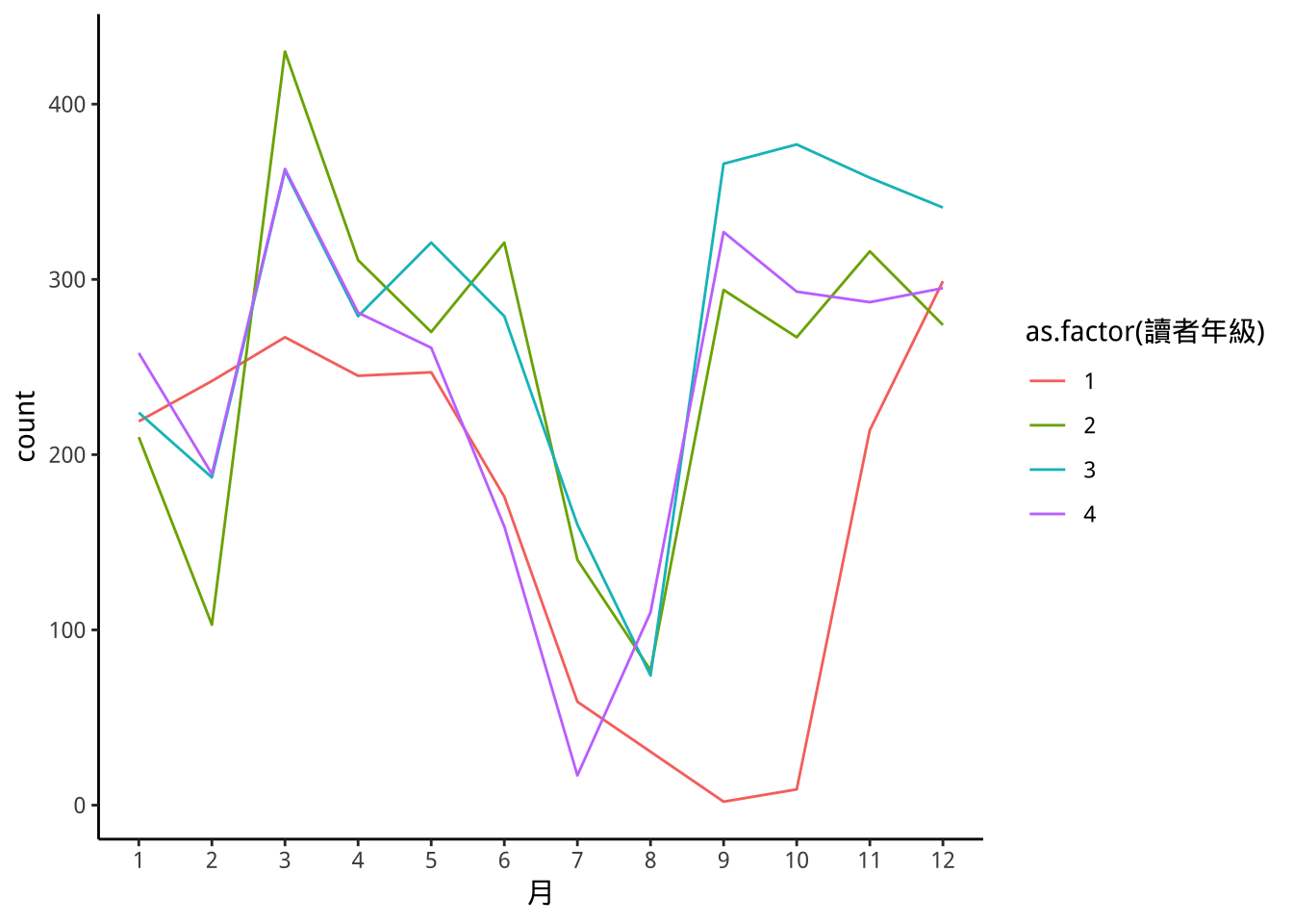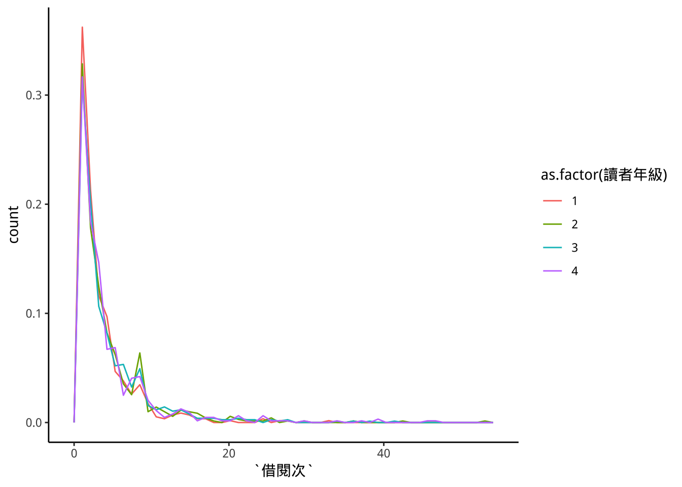geom_freqpoly(aes(color=as.factor(讀者年級)),stat="count")+