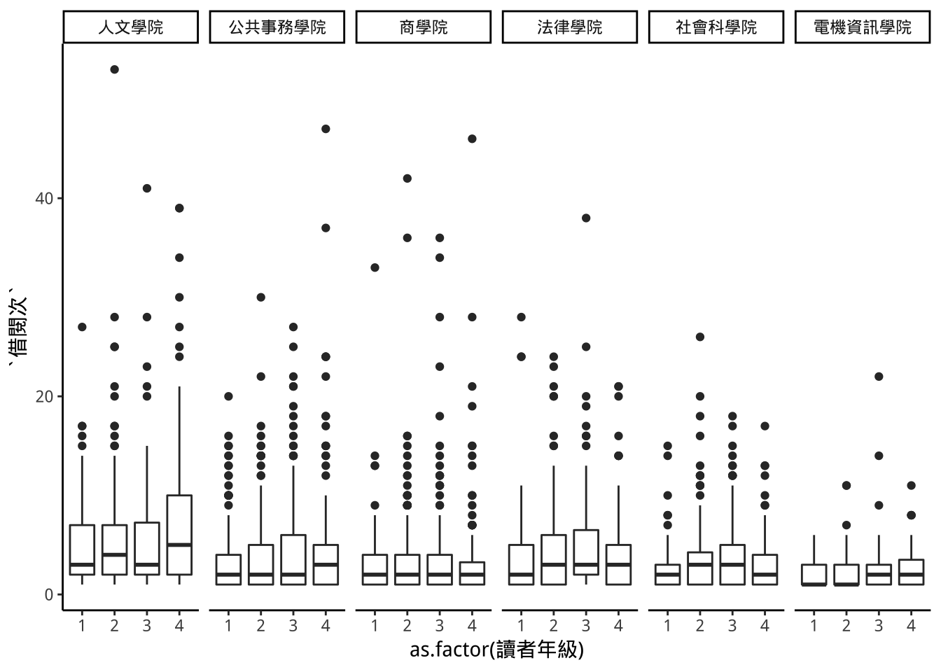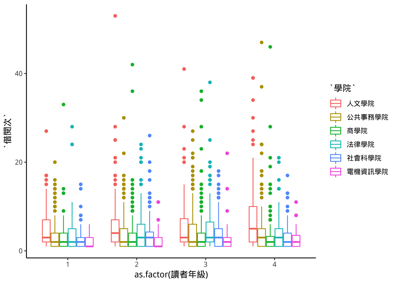 geom_boxplot(aes(y=借閱次,color=學院))-> p11; p11