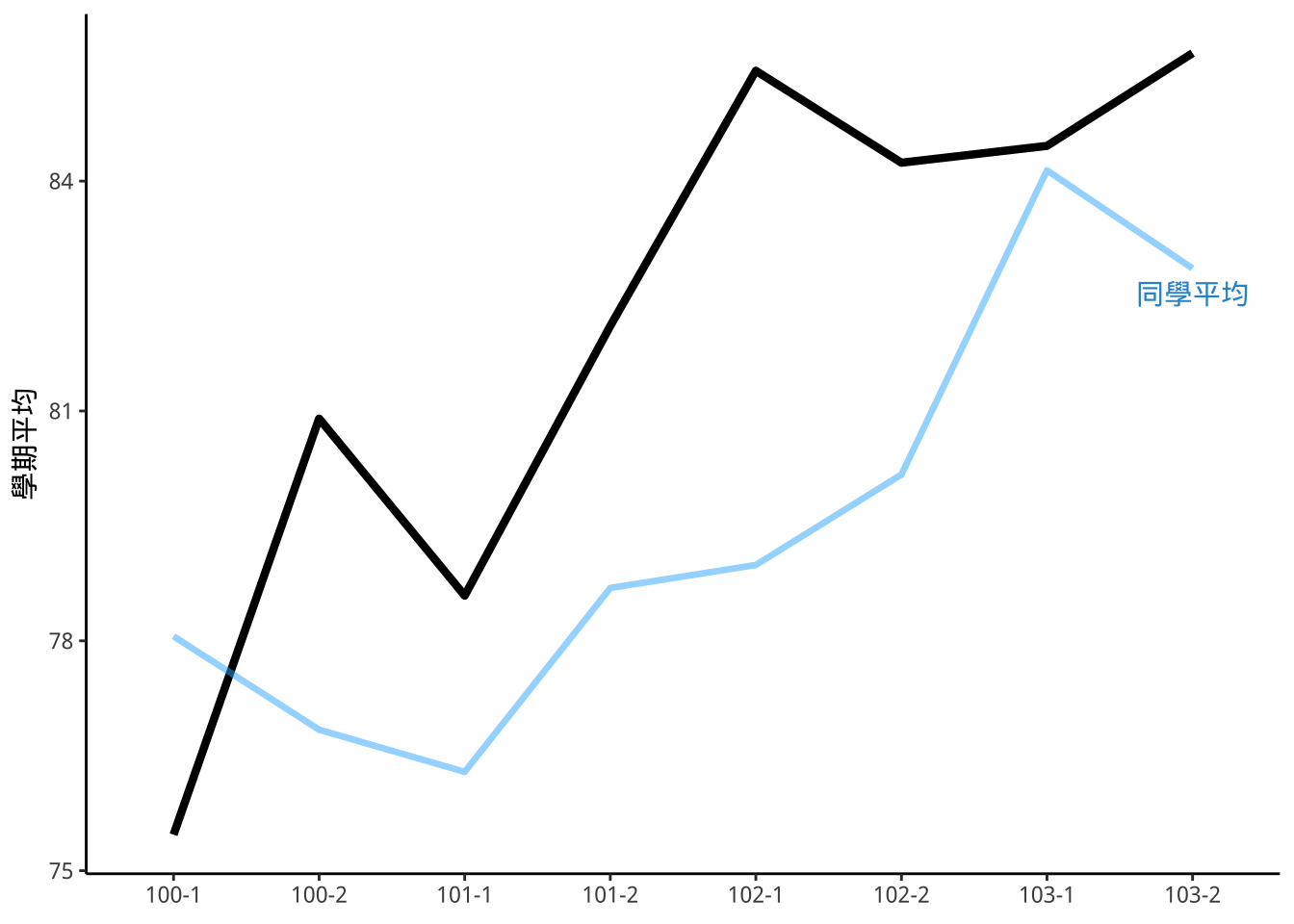 aes(x=學年學期,y=同學平均成績,group=1),