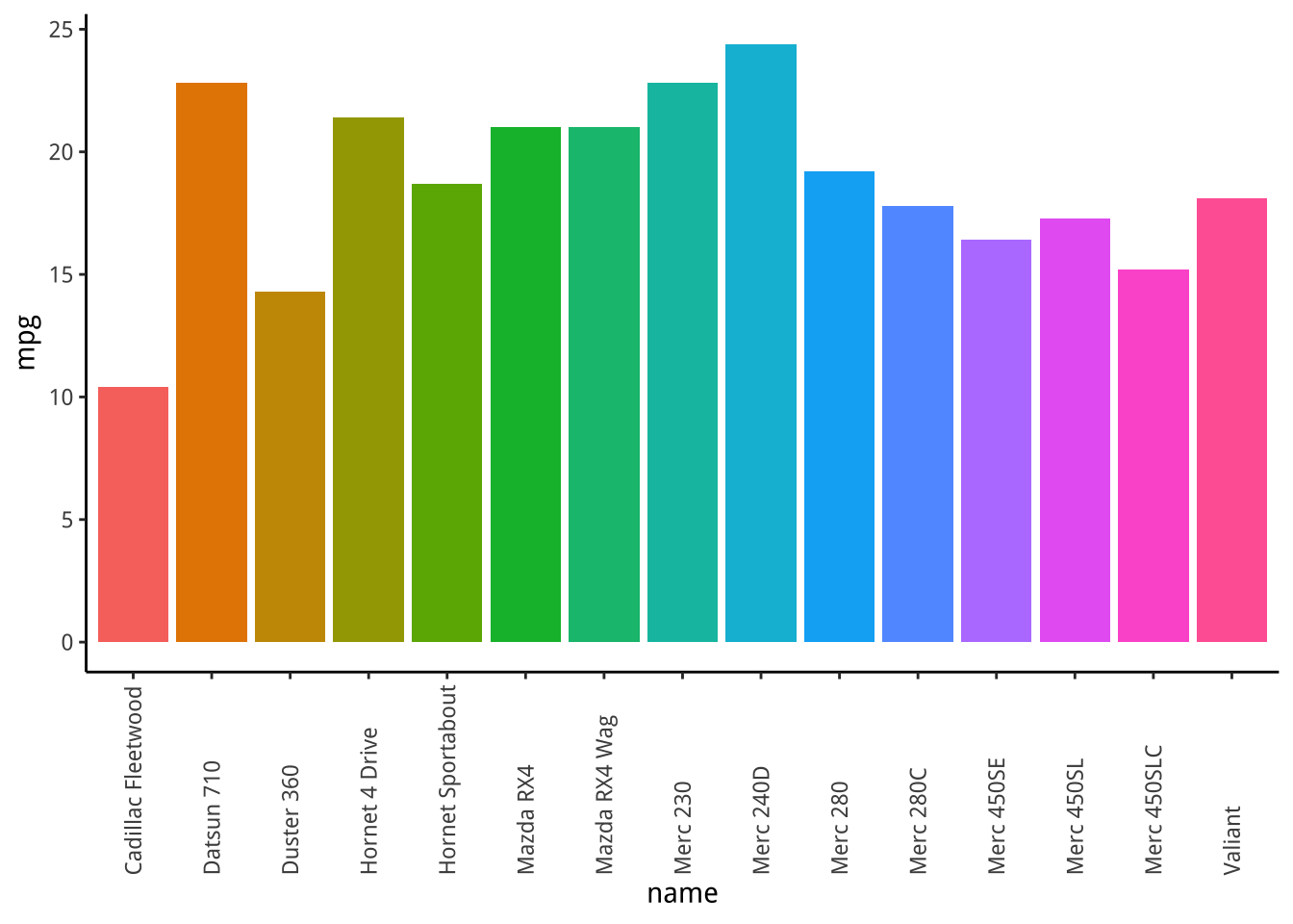 ggplot(mtcars2, aes(x = name, y = mpg, fill = name)) +