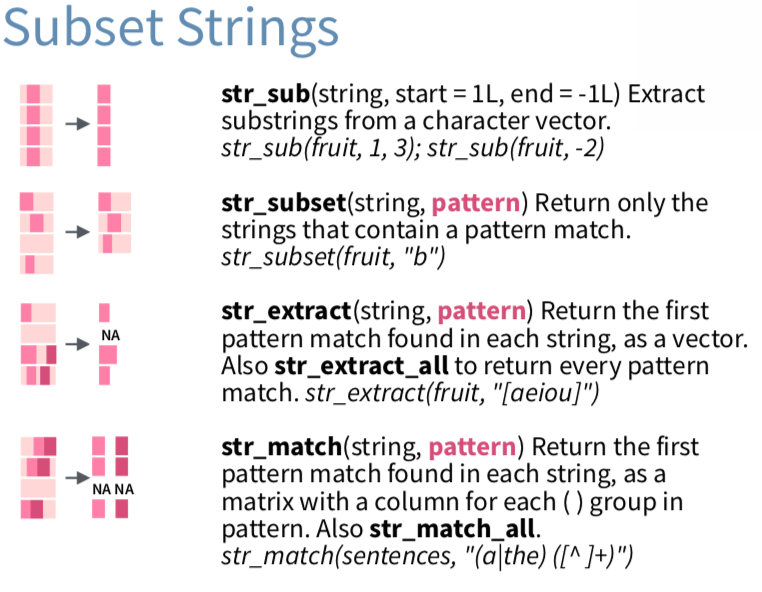 str_subset(): 保留字串向量元素裡符合某種規律(pattern)的向量元素——會縮小向量長度。