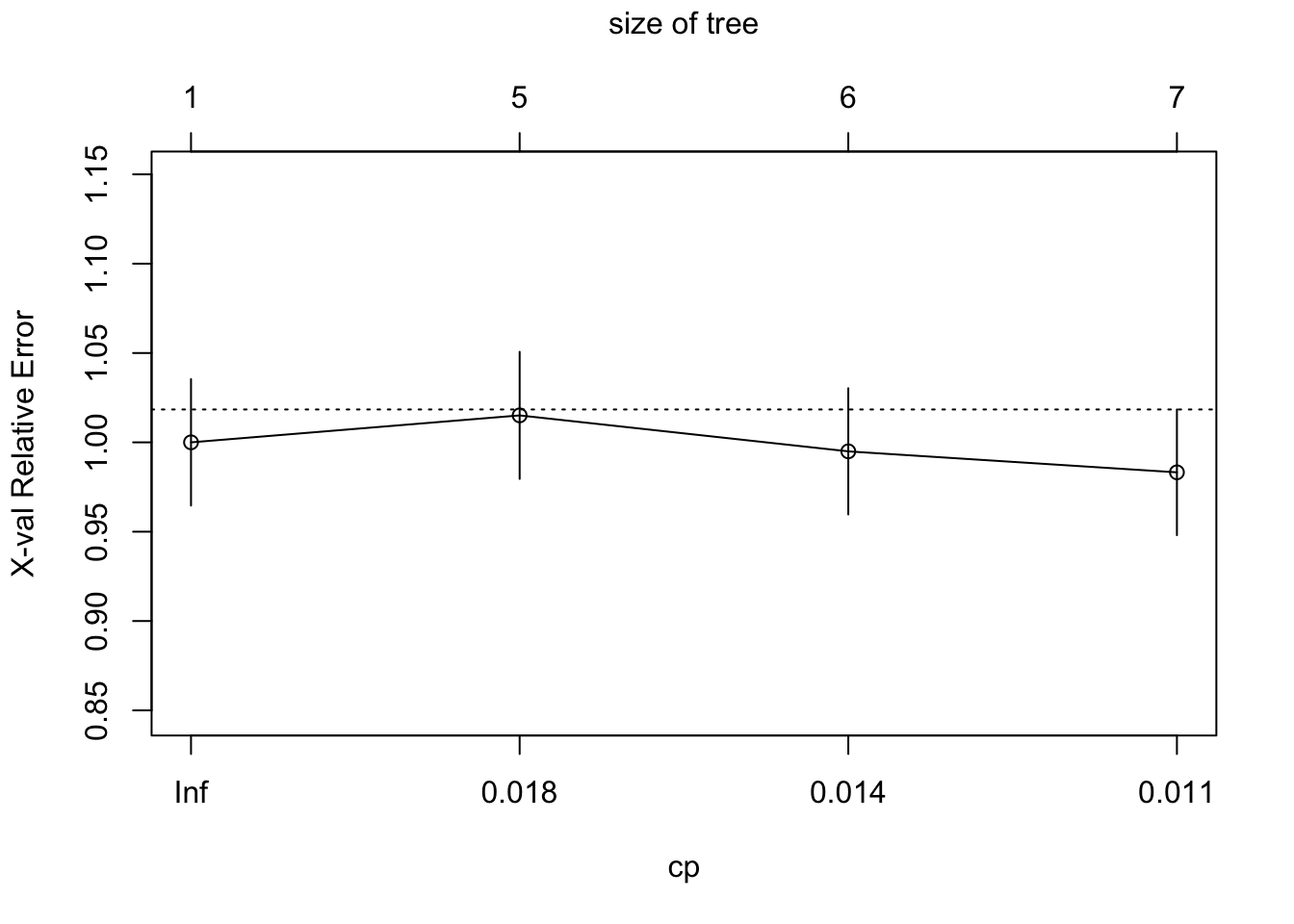 We can now prune the tree using a limit for the complexity parameter \(cp\). This will indicate that only a split with CP higher than the limit is worth it.