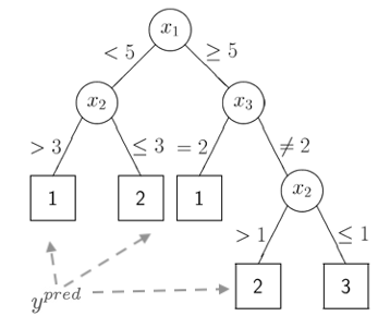 The figure above represents a classification tree with several brunches that partition the predictors space into disjoint regions according to some loss function. The predicted value for the outcome is found at the end of the branches.
