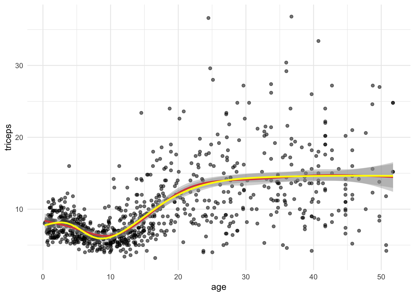tri.age.plot <- ggplot(triceps, aes(x=age, y=triceps)) +