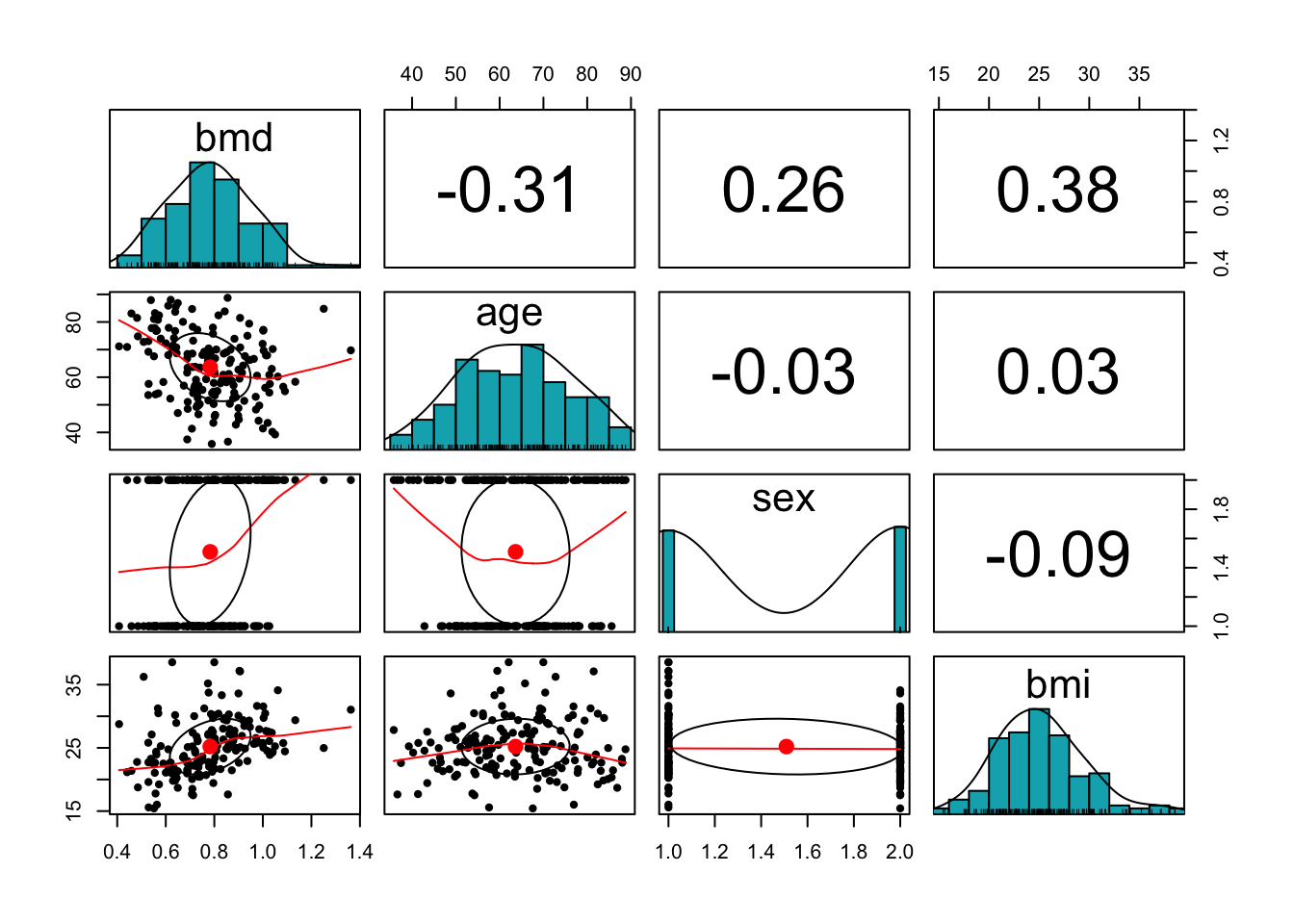 pairs.panels(bmd.data[c("bmd", "age","sex", "bmi")],