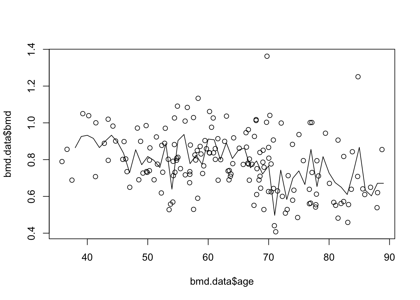 plot(bmd.data$age, bmd.data$bmd) #adding the scatter for BMI and BMD