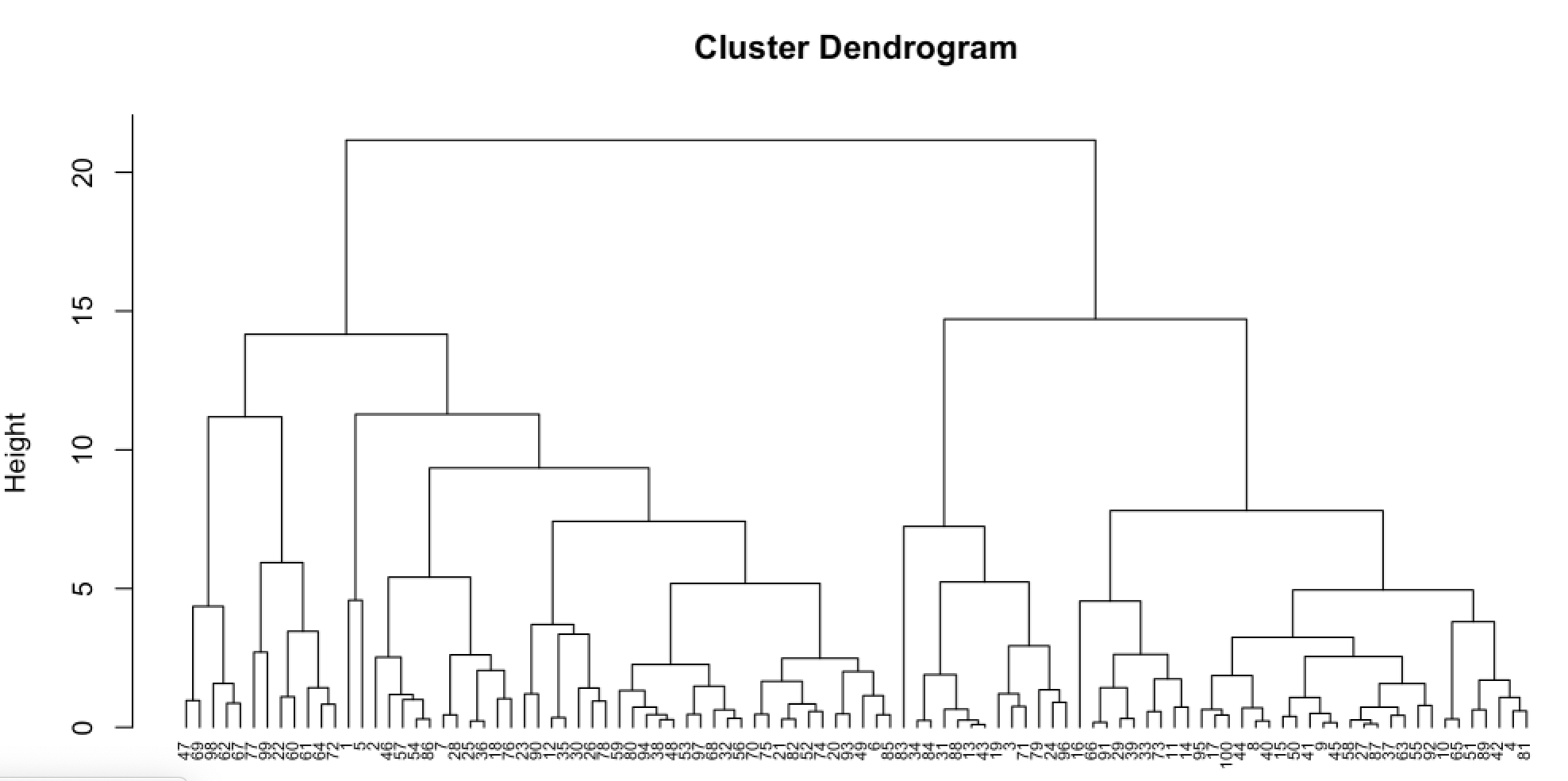 If we cut the tree at the height of 20, we get 3 clusters