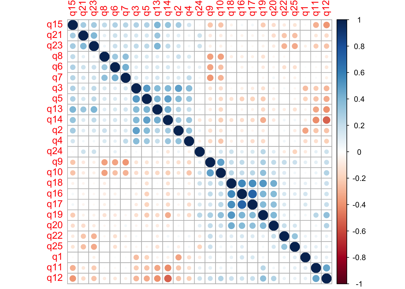 At a quick glance I see high positive correlation between q16-q20. There’s another group of high positive correlation between q2-q5 and q13-q15. I also see high negative correlation between q6-q10. We don’t need to read any further into it, other than it’s good to see high inter-variable correlations at this point.