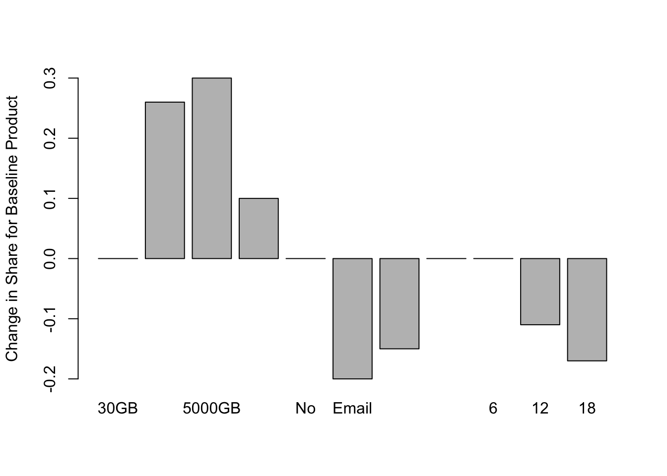 Now, each attribute level is assigned a utility, shown by the “Estimate” column. Notice how one attribute level is dropped from each attribute. These are the reference-levels of each attribute and are set equal to zero. The other attribute level utilities are interpreted relative to their corresponding reference level. For example, 2000GB (+1.18) and 5000GB (+1.35) are more attractive than the 30GB (0) option. On the other hand, $18/mo (-1.70) is less attractive than $12/mo (-0.84) and $6/mo (0).