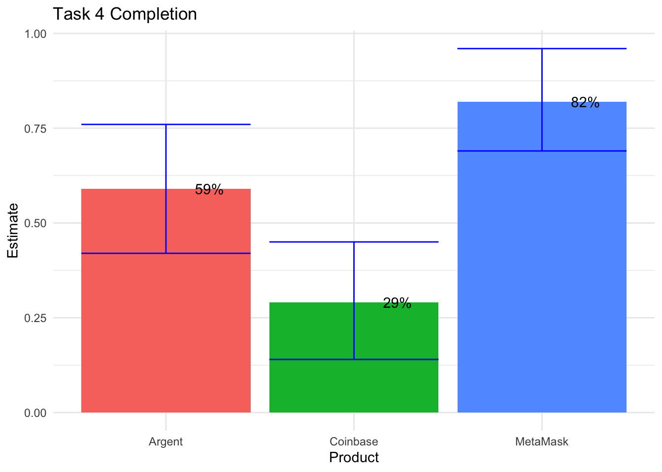 And all p-values, for the pairwise tests, are below .15, which indicates that all “task times” are significantly different from one wallet to the next, at the 85% confidence level. The final point estimates are printed below for the continuous variables. Remember that we use geometric mean as the point estimate for “task times”. Also, the system usability scores (SUS’s) are significantly different between the wallets (Coinbase > Argent > MetaMask).