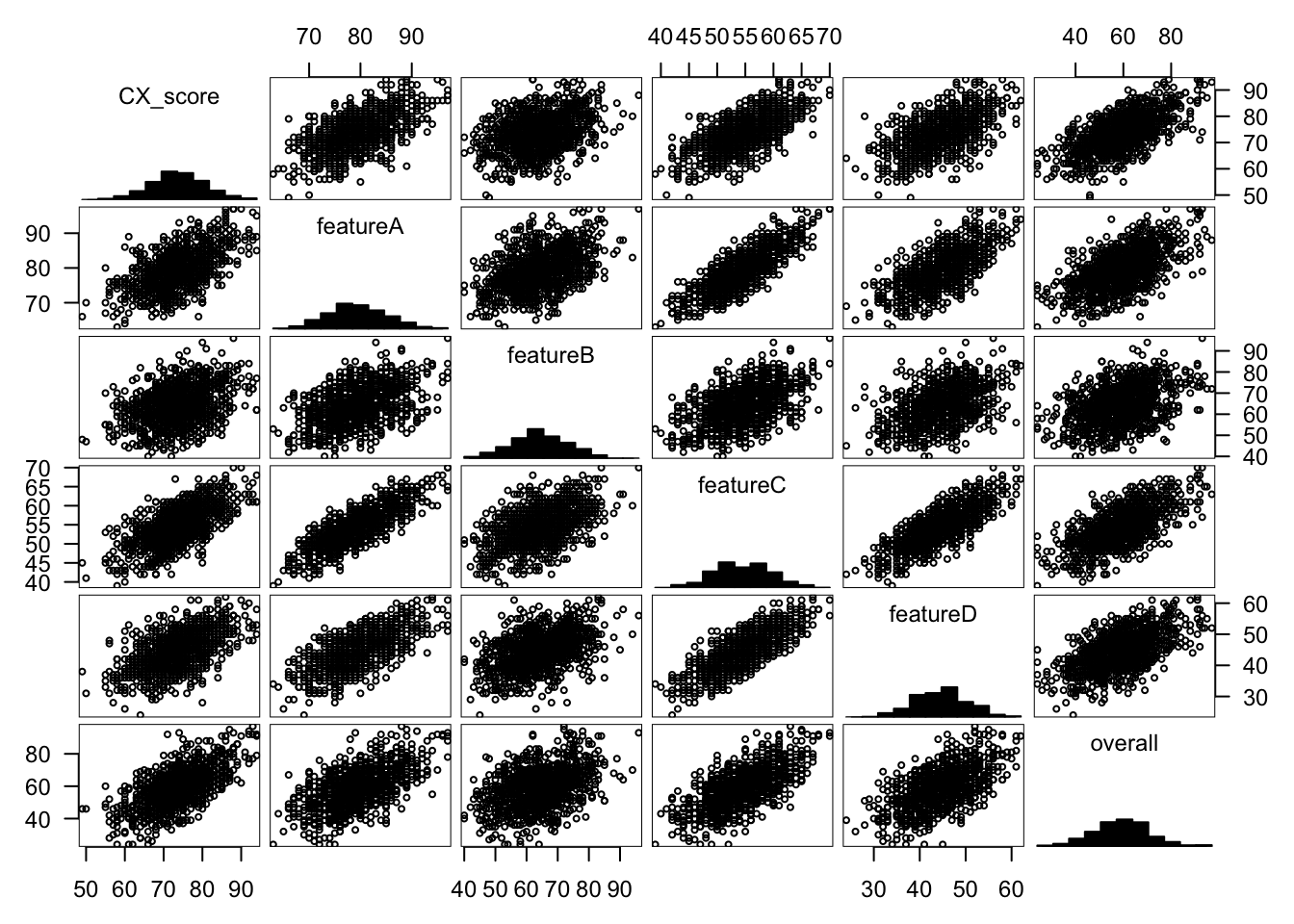 Indeed, all variables are normally distributed. Looking at the sixth column, we see eliptical scatterplot patterns, which indicate linear relationships between the predictor variables and the outcome variable. They are also positively correlated with one another which makes intuitive sense: as feature satisfaction levels increase, we expect overall app satisfaction to increase as well.