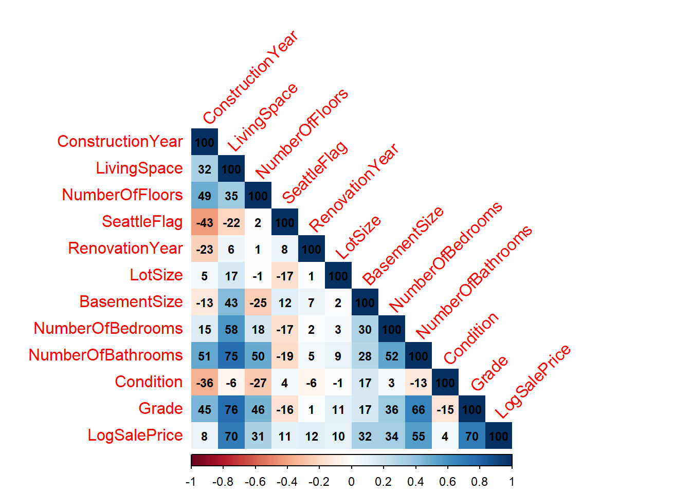 Factor Analysis is designed to group variables with high pairwise correlations. In the data, Number of Bathrooms, Grade, Living Space, Number of Bedrooms and LogSalePrice all have large pairwise correlations (see below). It is therefore compelling to perform a Factor Anaysis: