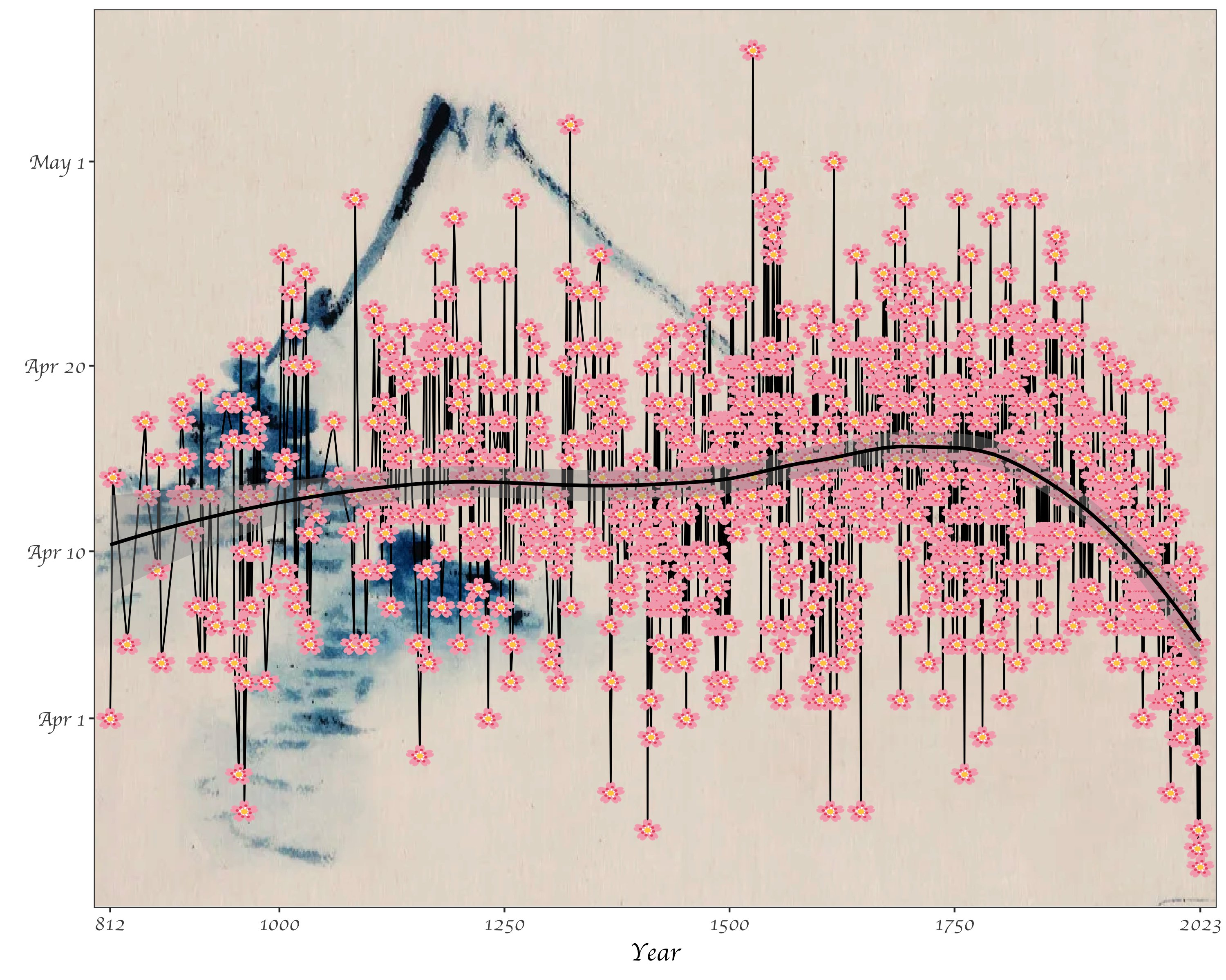 We can do some data science by hand, but statistical tools can help make our lives easier. Software such as R or Python are useful for efficiently analyzing cleaning data, analyzing data, and visualizing results. While you probably could make the plot of cherry blossom bloom times below by hand, it would take a really long time. Once you know R, you’ll be able to recreate this graph relatively easily. (As a side note, notice what this image is conveying: the trend toward earlier and earlier cherry blossom blooms as the planet warms. More on this later.)