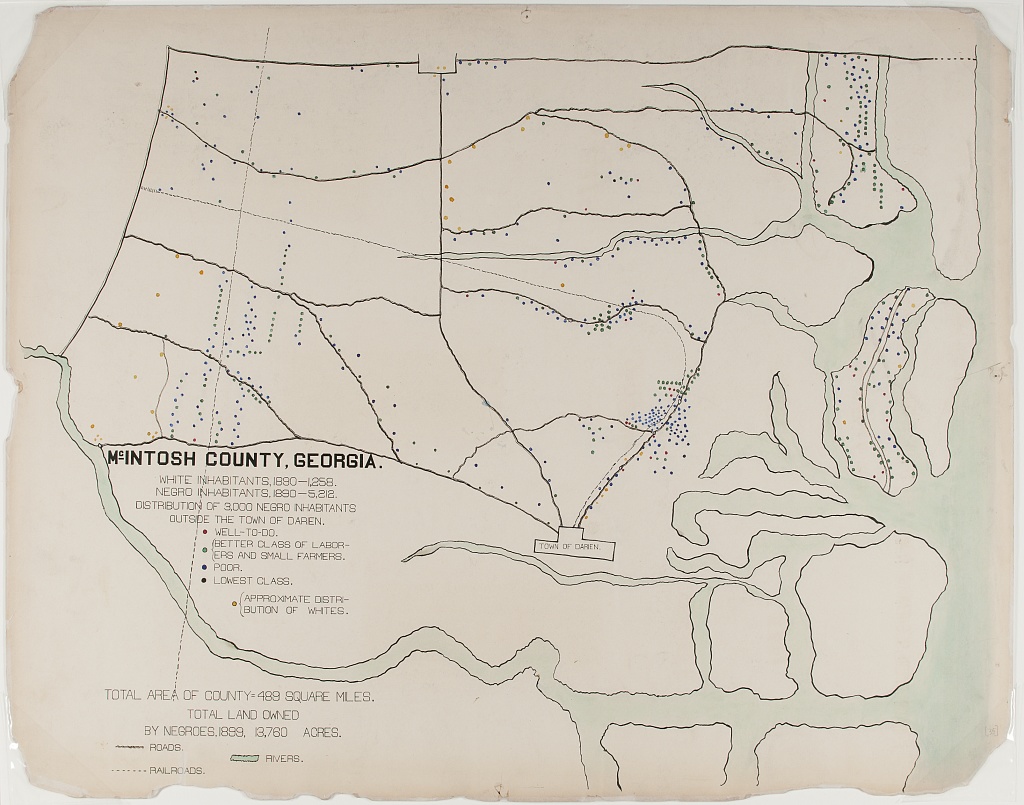 In the first, the geography of residence by race and class is shown for a McIntosh County in Georgia. This highlights the social station of Black residents outside the town of Daren, as well as their proximity to White residents. We can compare this to demographic dot maps from recent years.