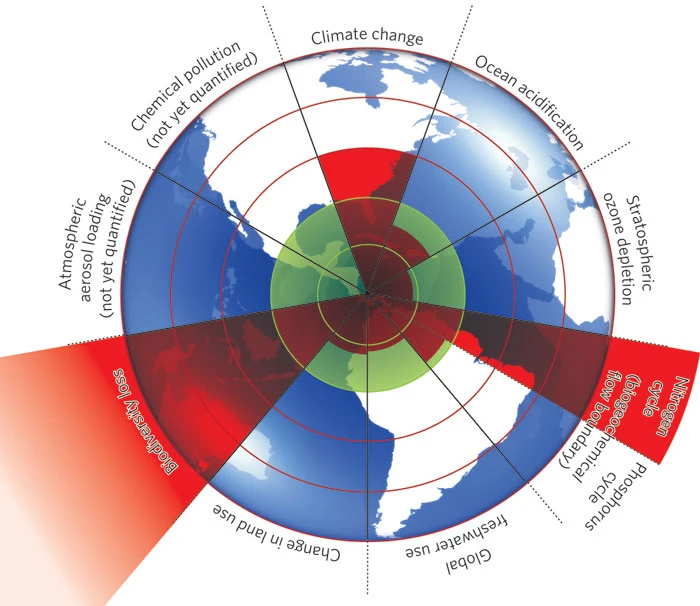 Scholars in the natural sciences are beginning to understand these changes through lenses of planetary bounds, and it may be useful to consider how these boundaries relate to our safety and functioning as societies. In 2009, a now-famous paper noted that climate change is one of multiple planetary bounds, including two others that have already crossed “safe” thresholds: biodiversity loss and interference with the nitrogen cycle. The following graphic illustrates these boundaries visually: