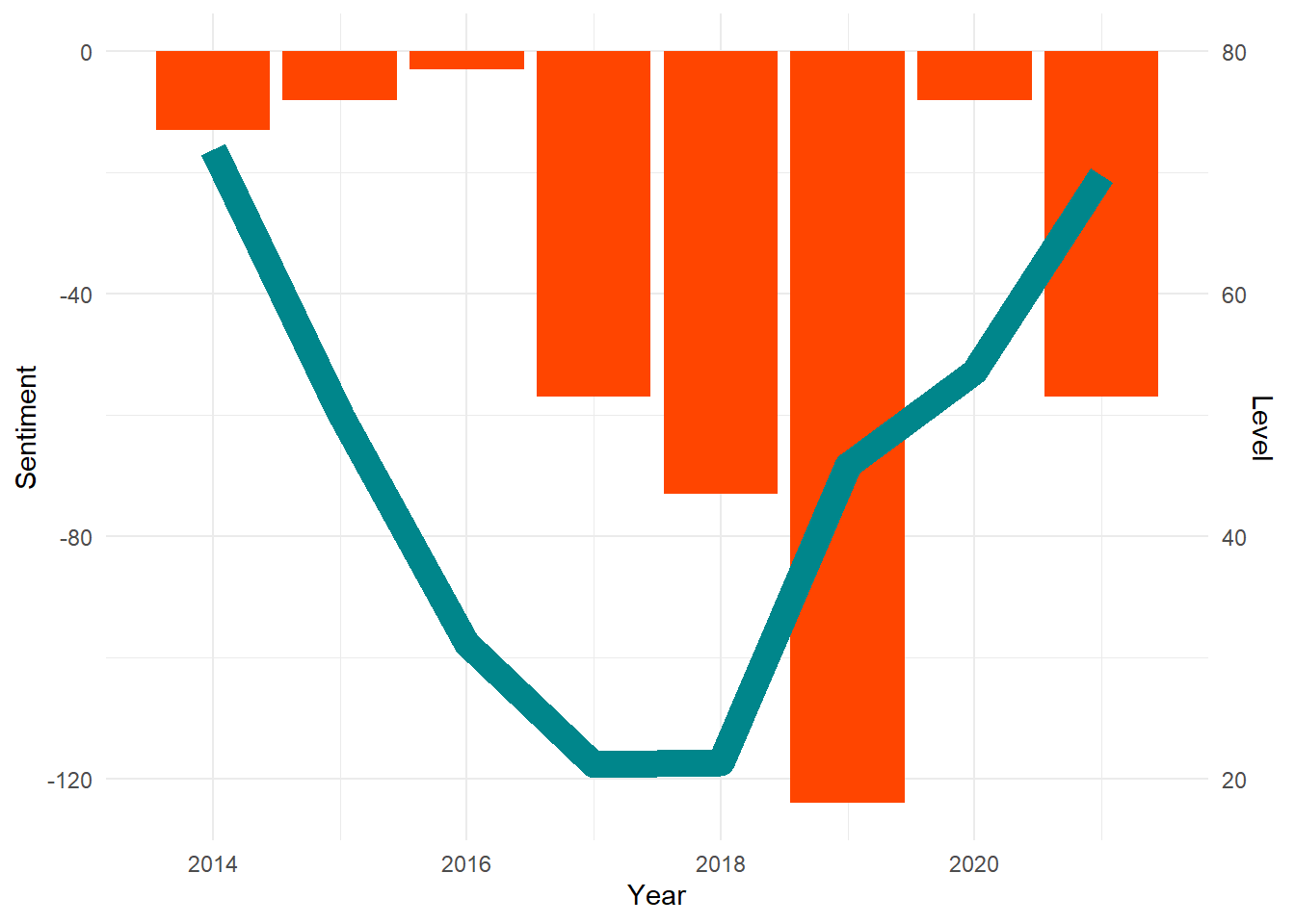 geom_col(aes(year, sentiment), fill = "orangered")+
