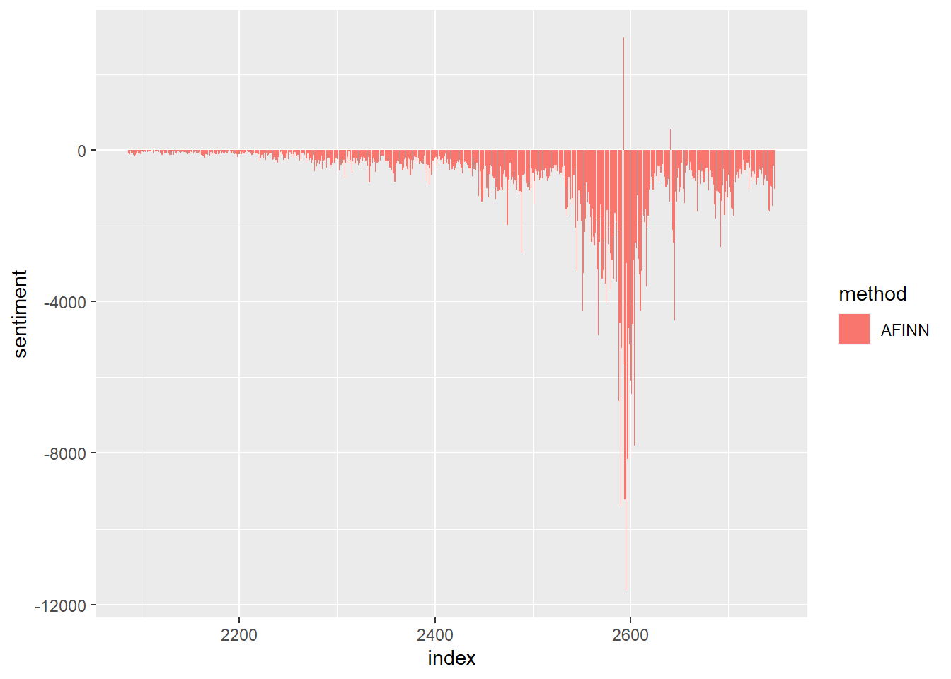 We can also look at sentiment over time. We’ll try using the Bing Lexicon, and aggregating the sentiment for periods of years (we note that each year has 31556926 seconds).