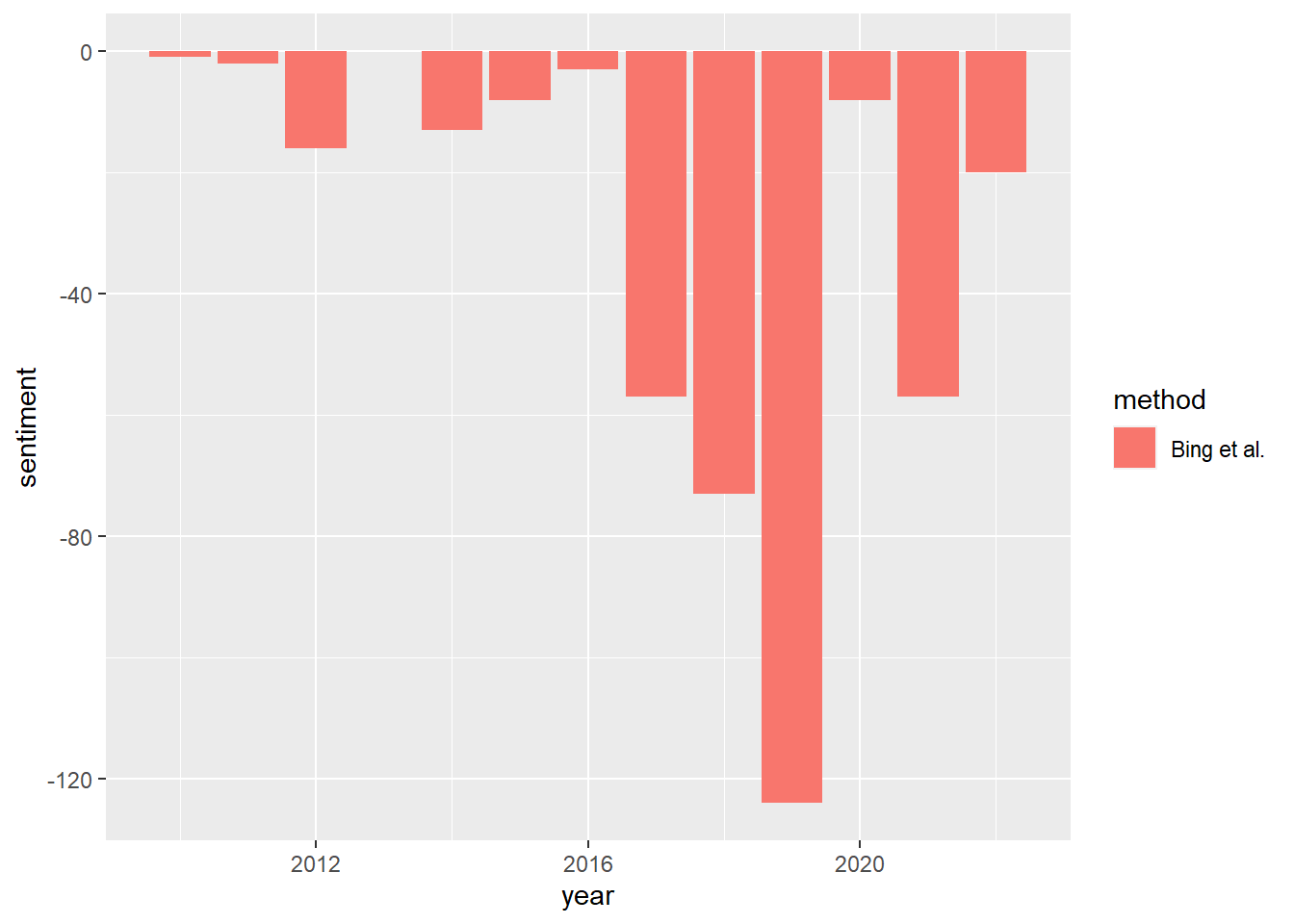 ggplot(bing_ct, aes(year, sentiment, fill = method)) +