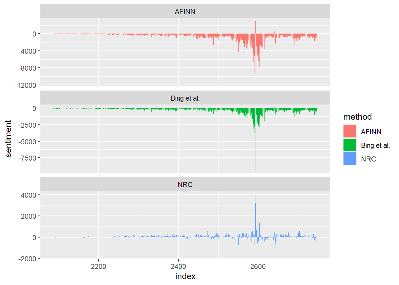 ggplot(all_three, aes(index, sentiment, fill = method)) +