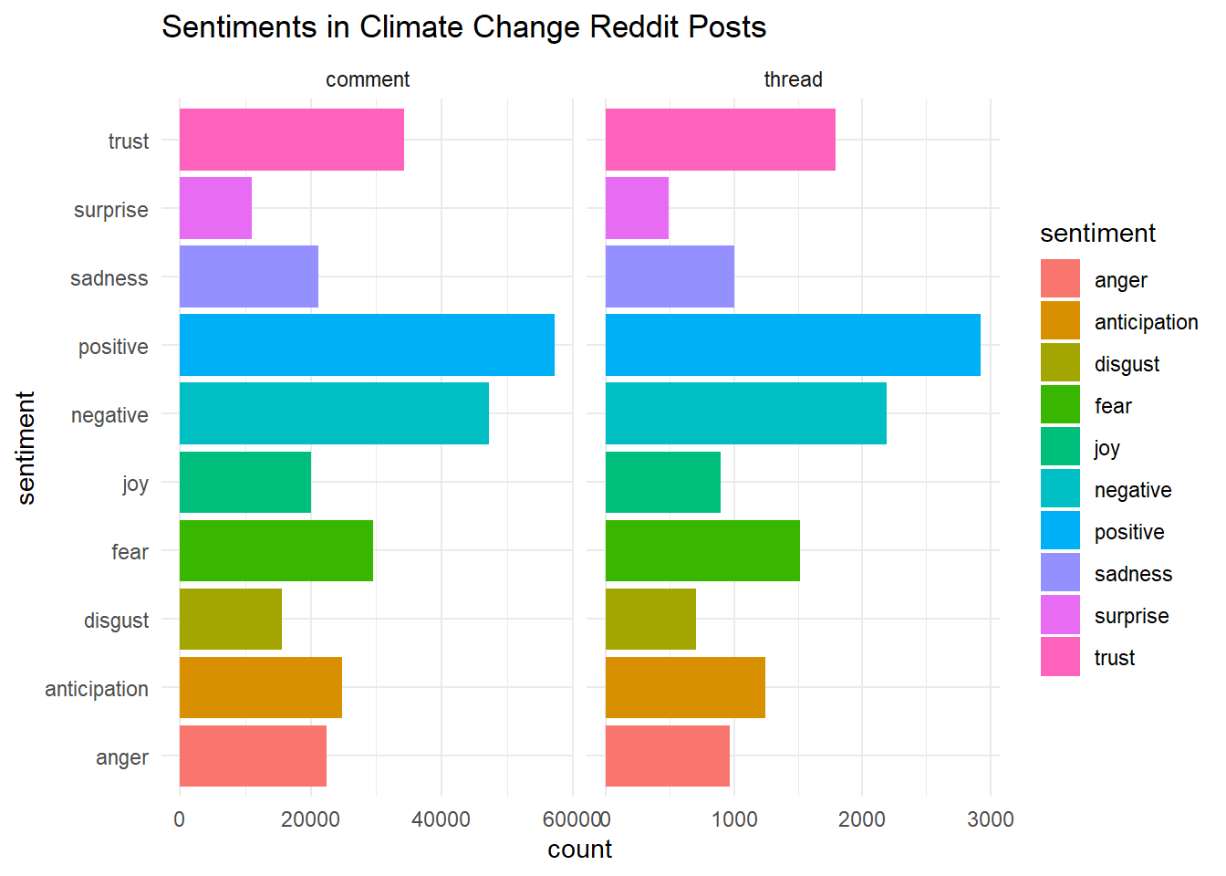 RedditextractoRpackage to get the thread content of posts related to this topic. Put your data intidytextformat, and show the first 6 rows of the threads and comments, separately.Using the NRC lexicon, create a chart of sentiment for your comments or threads, similar to the one in section 4.3. BONUS: try comparing the sentiment of your comments and threads!
