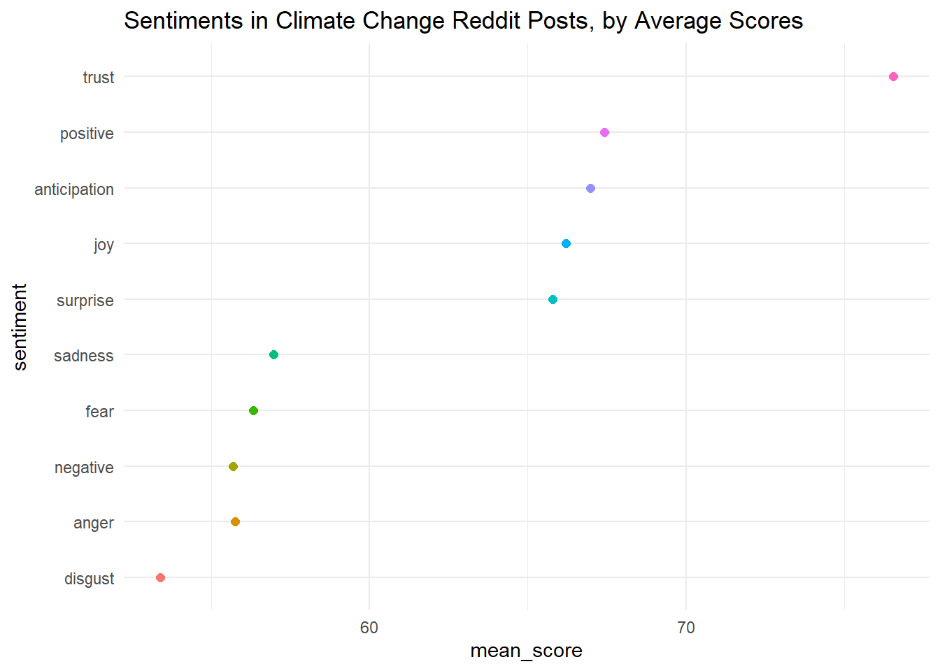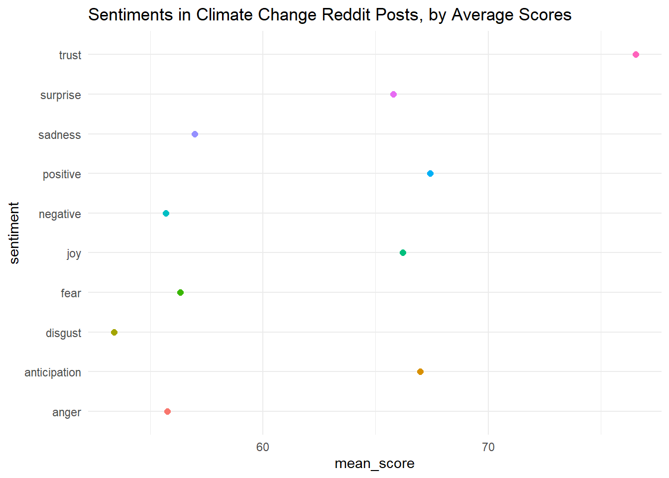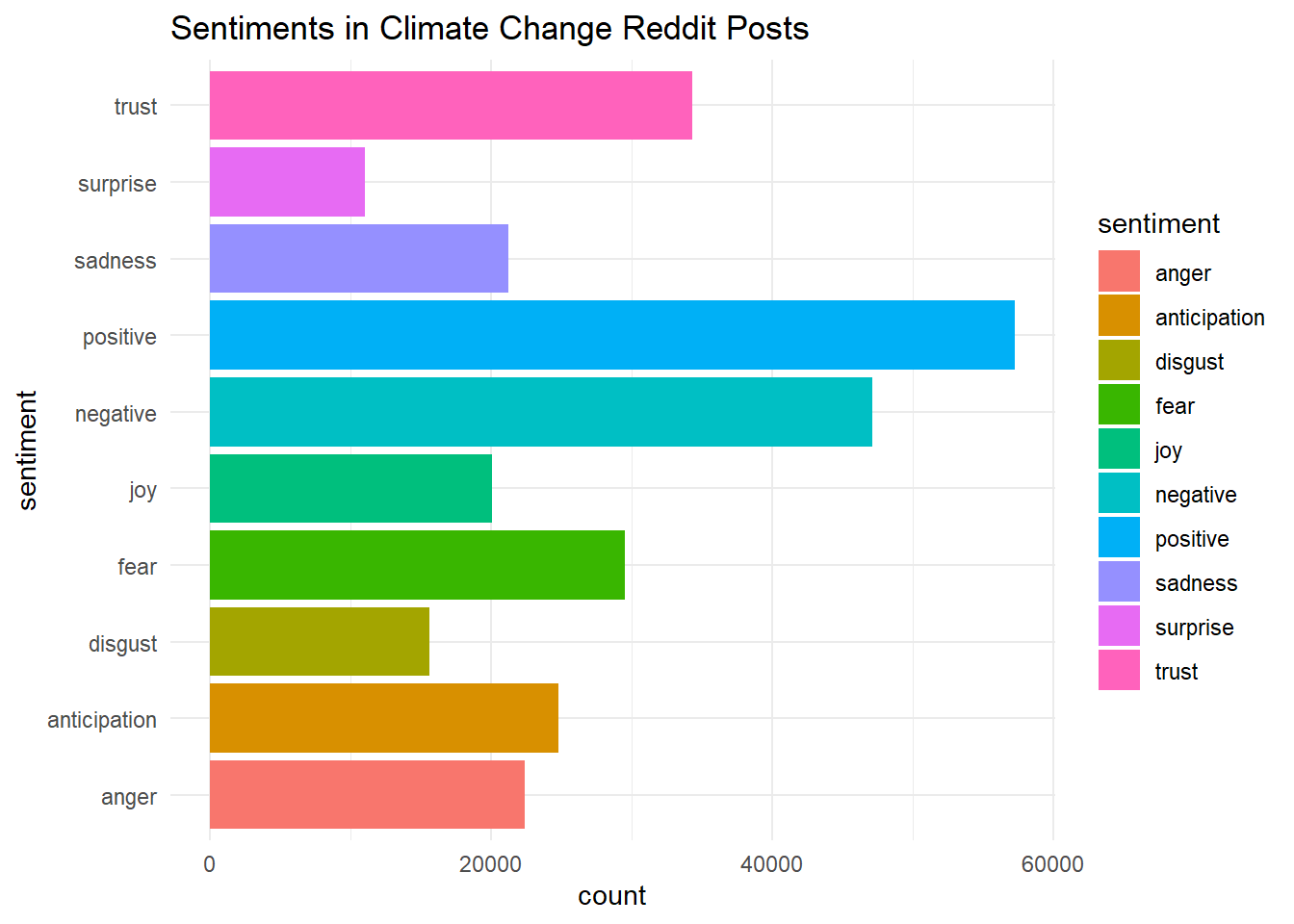 Perhaps unsurprisingly, the frequencies of negative words are much larger than those of positive words. The words “crisis” and “drought” contribute the most to negative sentiments. The next two words, however, are perhaps not so obvious: “horrifying” and “blame.” These give us a fuller picture of the sentiments that appeared, at least on the social media site Reddit, as people discussed this topic.