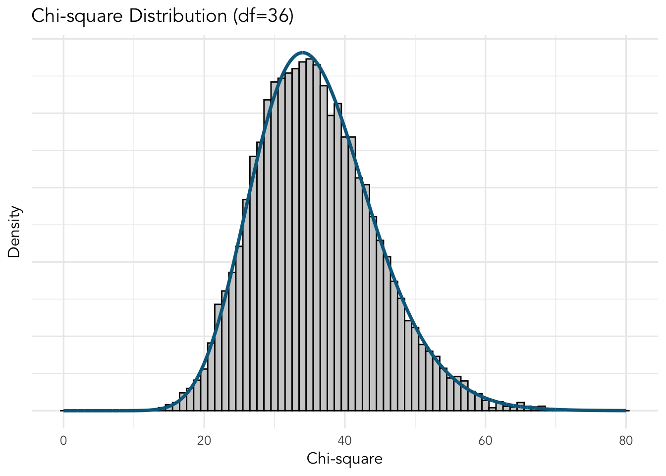 We can recreate this figure. First, we will reuse our extant chi-square distribution that we simulated above (\(df=4\)). Second, we simulate a new chi-square distribution with 36 degrees of freedom. Then, we will divide pairings of each and plot the histogram. Although the actual F-distribution is created using fancy calculus, I will divide 1 of each distribution by 1 of the other. Although this is not an exact estimation, it should be a decent approximation with 10’000 samples each. Here is our simulated chi-square (df=36) distribution: