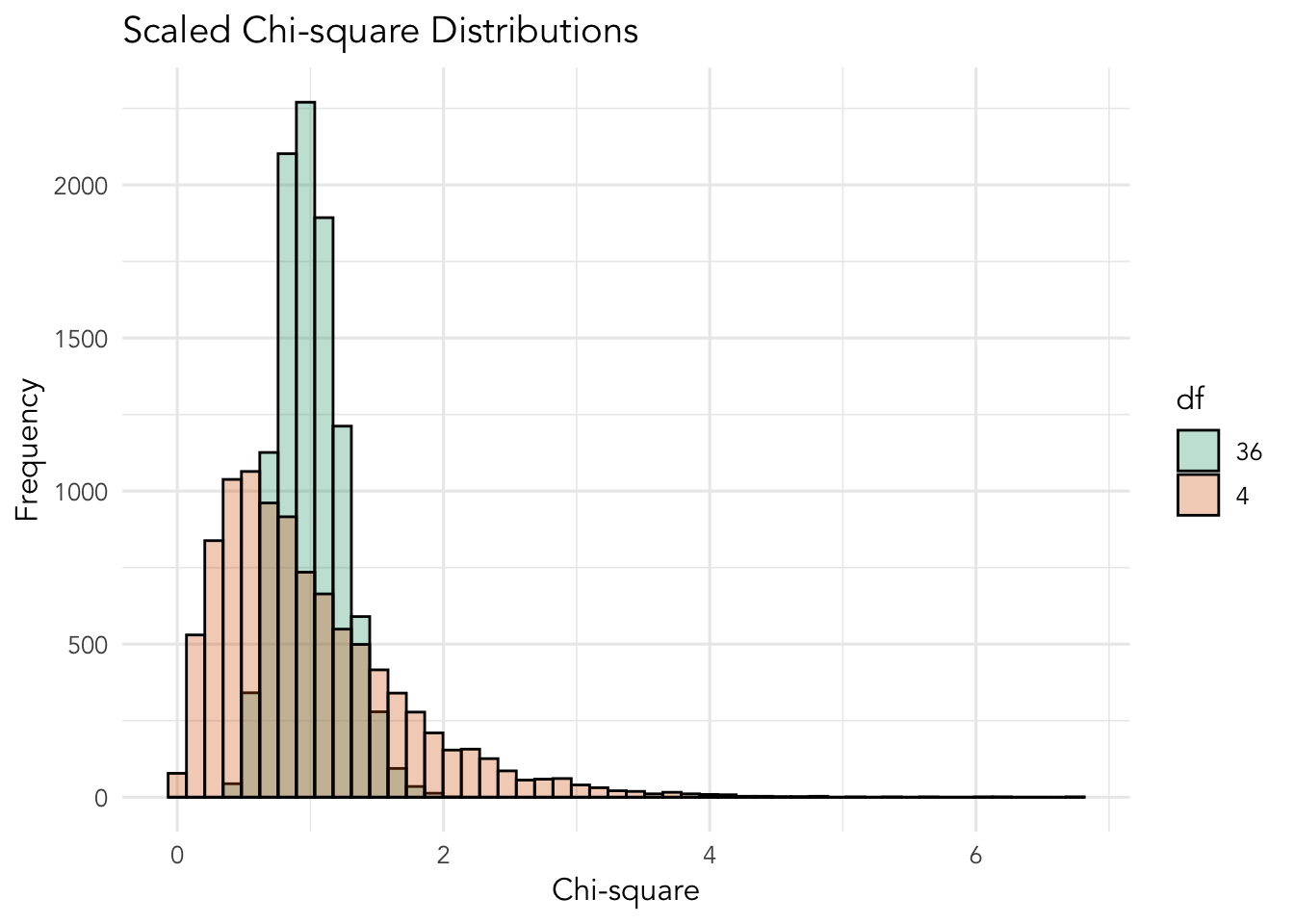 Thus, we can scale the chi-square by dividing by df, which will give us estimate of a variance.