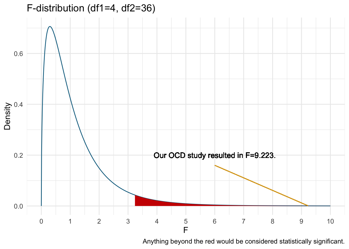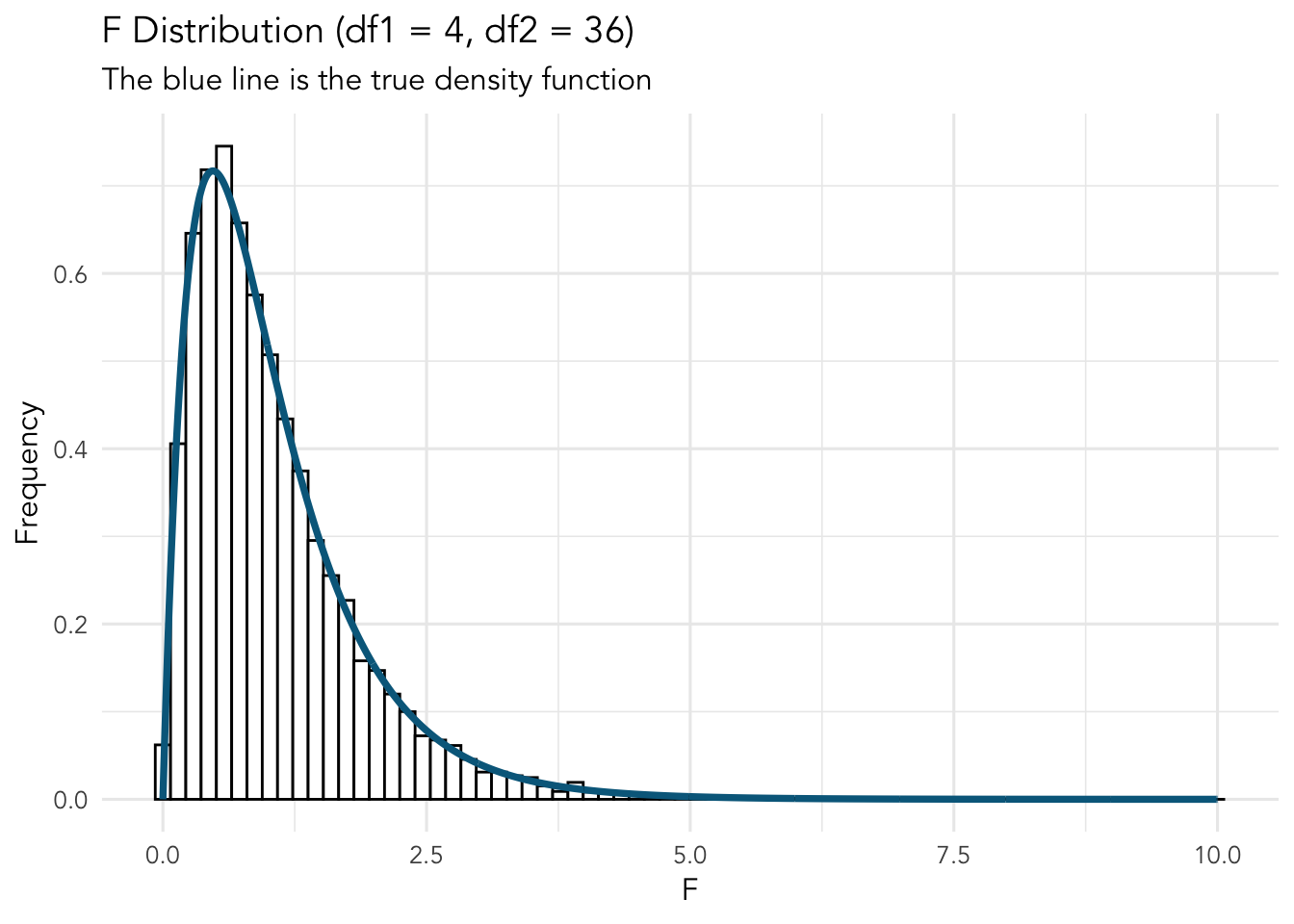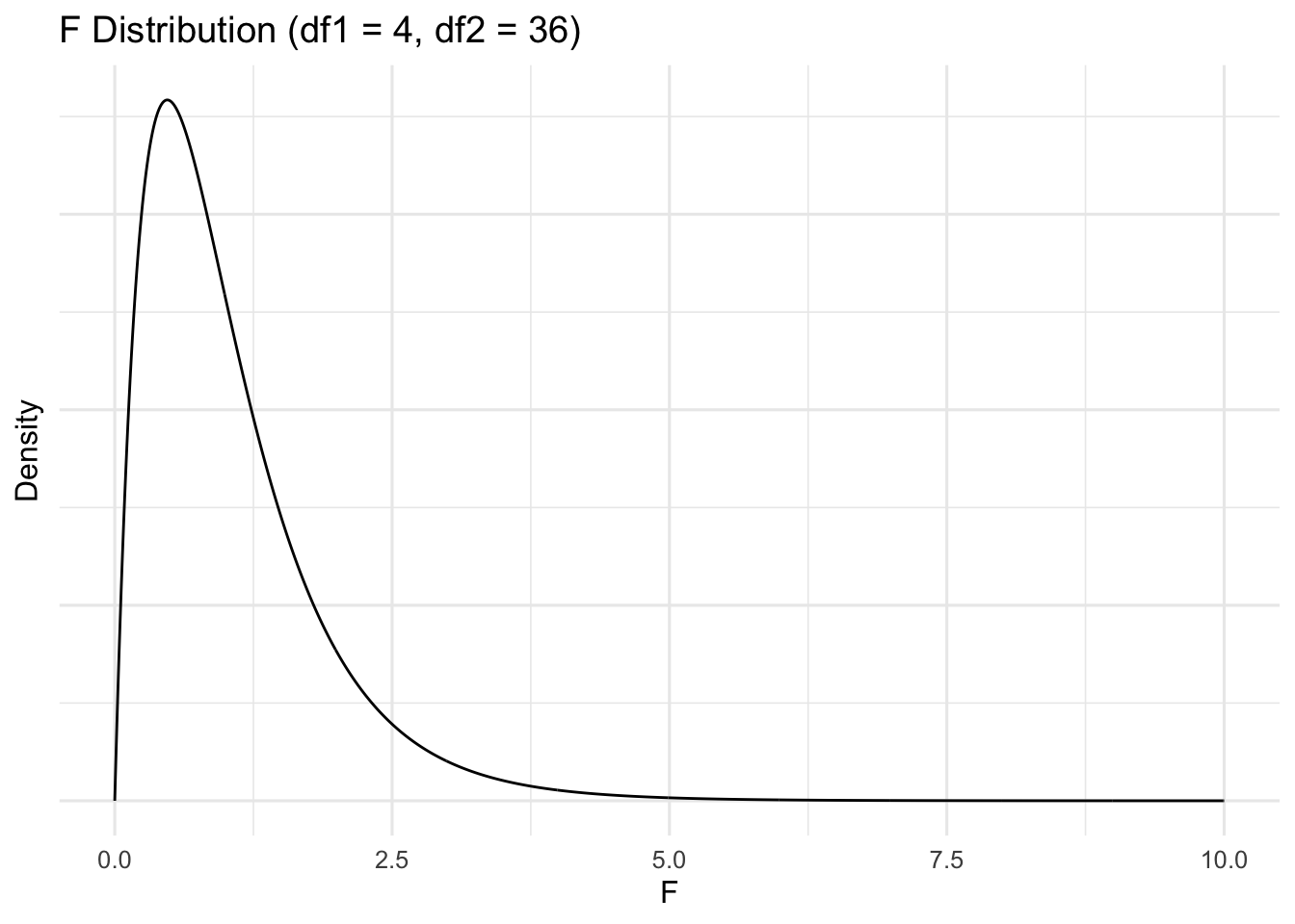 Thus, the F-distribution is approximately the ratio of two variances that some from the same population. If you were to infinitely sample from a population, scale the resulting chi-squares, and get their ratio, you would end up with the F-distribution. What do these variances have to do with ANOVA? Well, ANOVA estimates the ratio of the variance in the means of the IV group(s) (mean squared between; \(MSB\)) to the variance between each individual’s score within a group with that group’s mean (i.e., mean squared error/within; \(MSE/MSW\)). If the groups do not differ (i.e., they are randomly sampled from the sample population), the variances should be approximately equal. Given that they are assumed through the null hypothesis to be from the same population, the resulting F-distribution should be the ratio of chi-squares. An example of an F-distribution with \(df_1=4\) and \(df_2=36\) (i.e., the numerator variance is chi-square with \(df=4\) and the bottom chi-square with \(df=36\)).