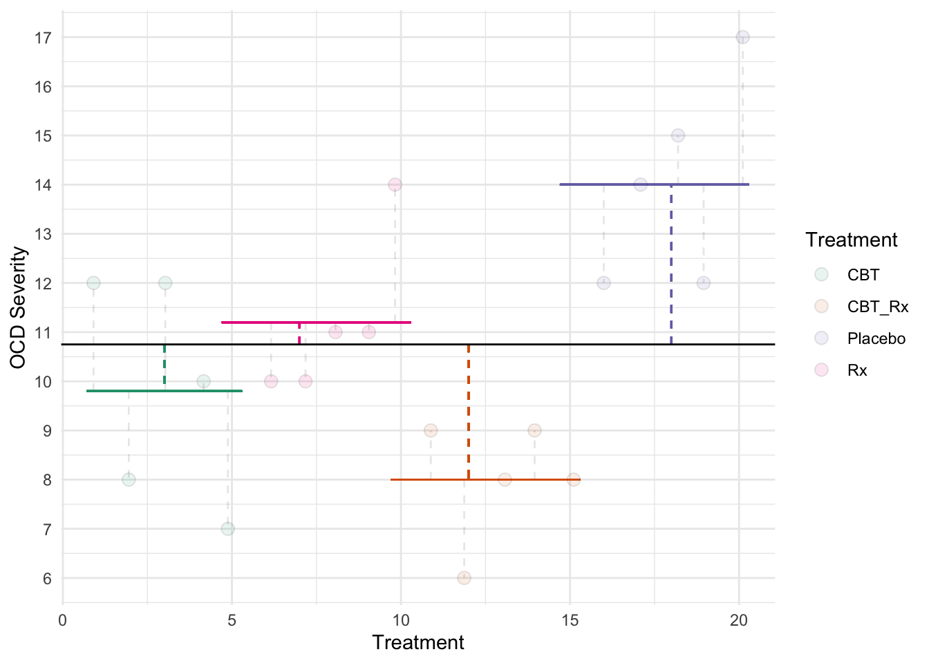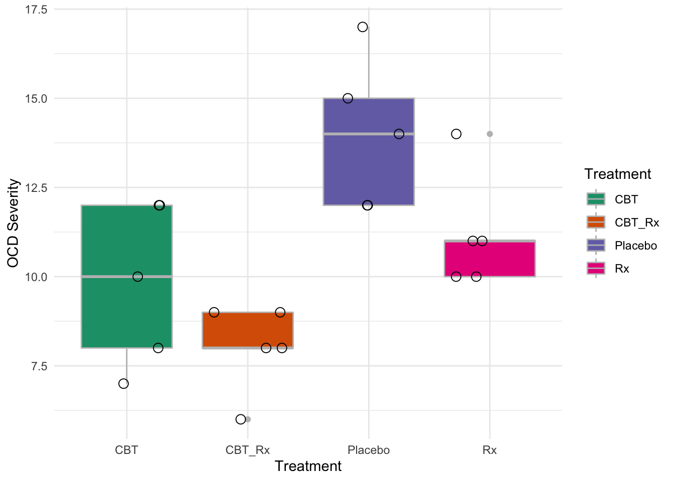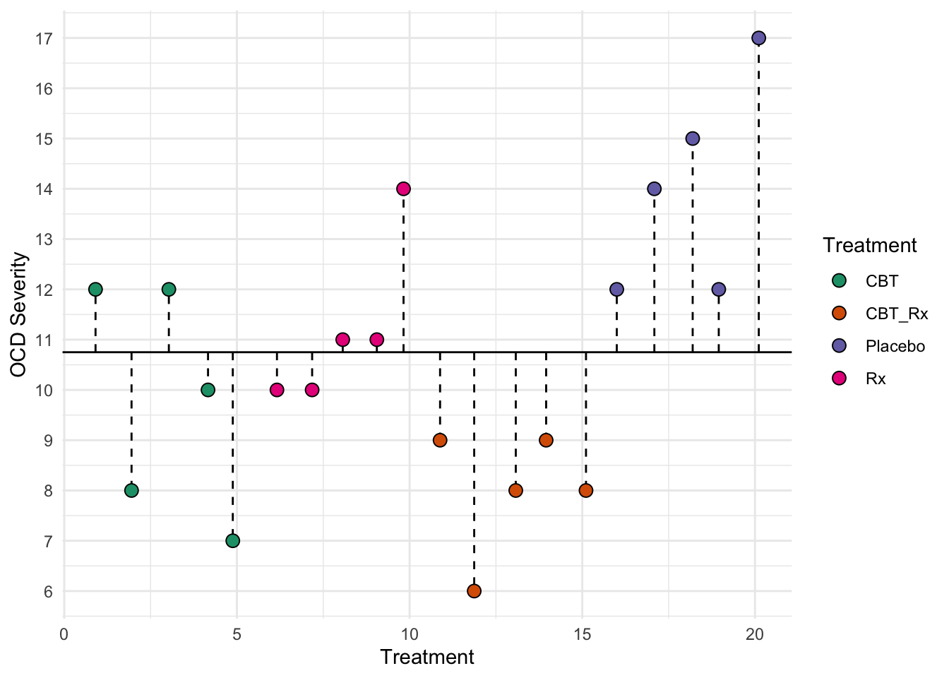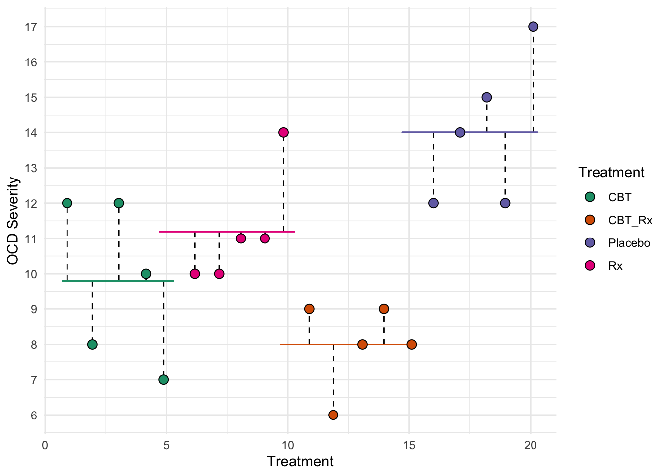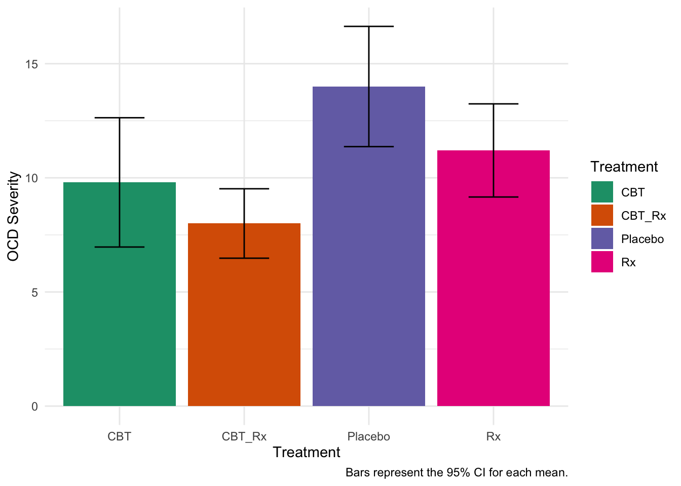 O’Connor et al. (2006) compared the efficacy of treatments for obsessive compulsive disorder. They measured the severity of OCD symptoms, with lower scores indicating better outcomes (i.e., fewer symptoms). Specifically, they compared differences in OCD severity after individuals received one of: